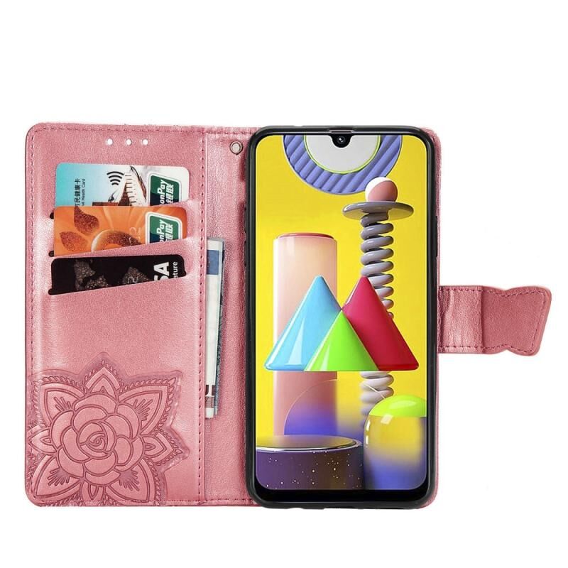 Θήκη δέρματος οριζόντιας αναδίπλωσης για Galaxy M31 με ανάγλυφο σχέδιο πεταλούδας και λουλουδιών, με βάση στήριξης / υποδοχή κάρτας / πορτοφόλι / κορδόνι (ρόζ)