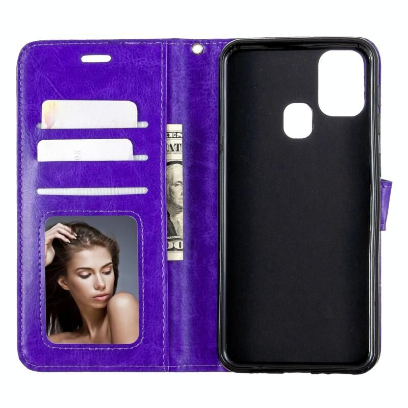 Για Galaxy M31 Crazy Horse Υφή οριζόντια Flip δερμάτινη θήκη με θήκη & υποδοχές για κάρτες & πορτοφόλι & πλαίσιο φωτογραφιών (μωβ)