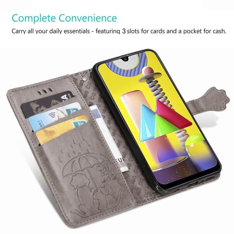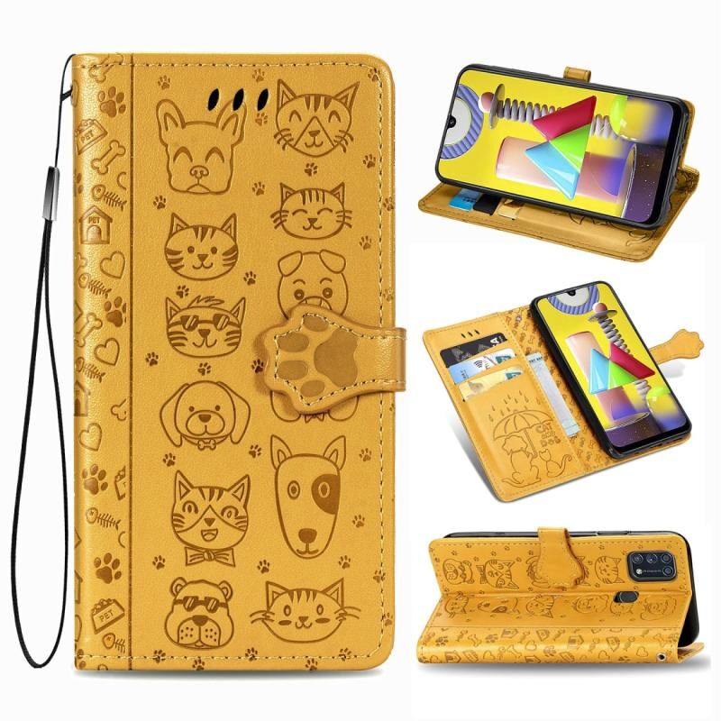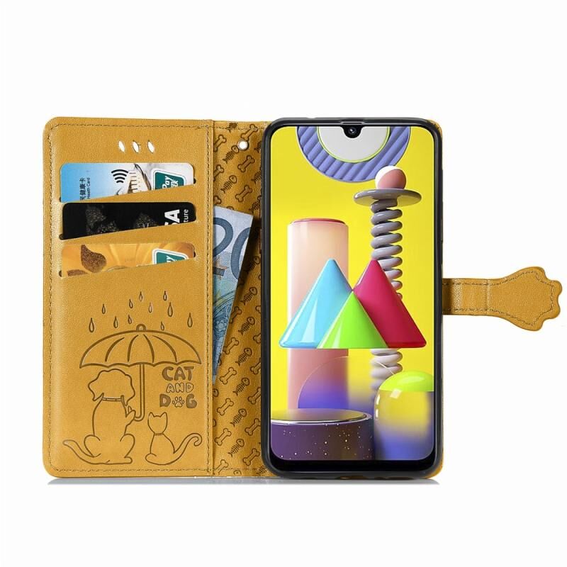 Θήκη δέρματος οριζόντιας αναδίπλωσης με ανάγλυφα σχέδια χαριτωμένων γάτας και σκύλου για Galaxy M31, με βάση στήριξης / υποδοχή κάρτας / πορτοφόλι / κορδόνι (Ροζ)