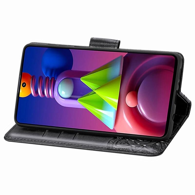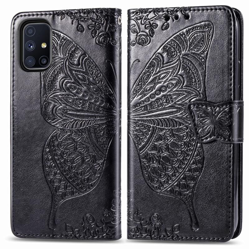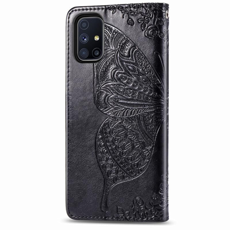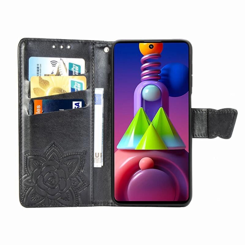 Θήκη βιβλίου από δέρμα οριζόντιας αναδίπλωσης για Galaxy M51 με ανάγλυφο σχέδιο πεταλούδας και λουλουδιών, με βάση στήριξης / υποδοχή κάρτας / πορτοφόλι / κορδόνι (Μαύρο)