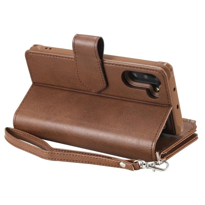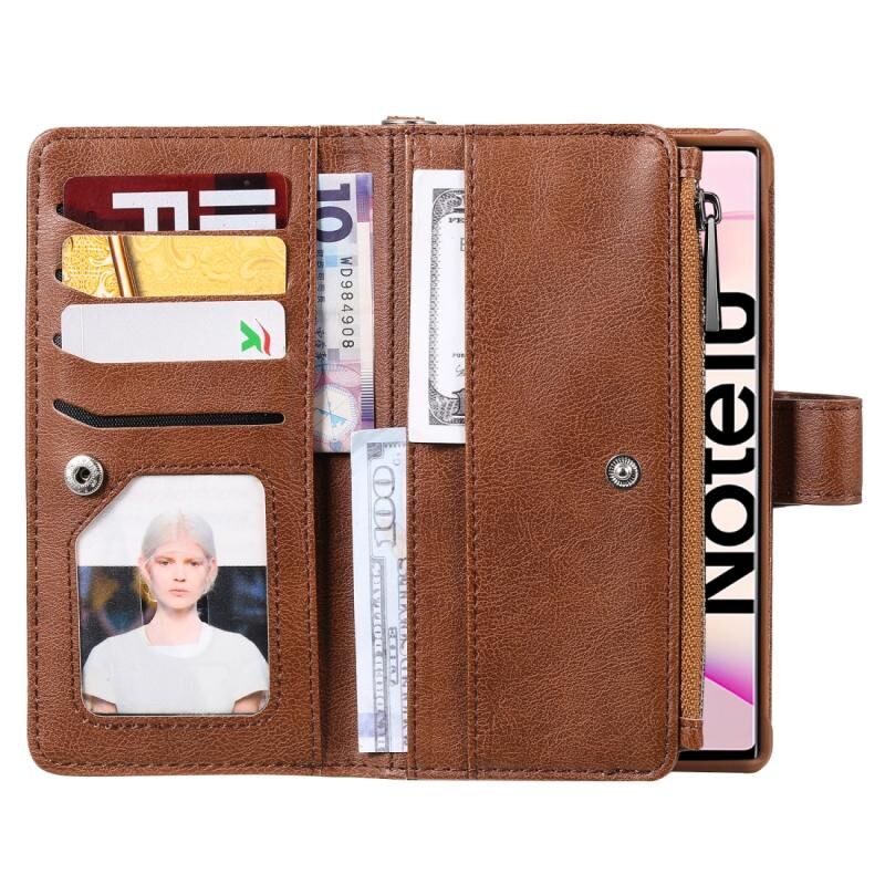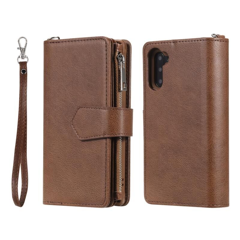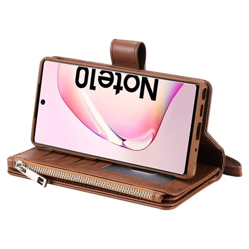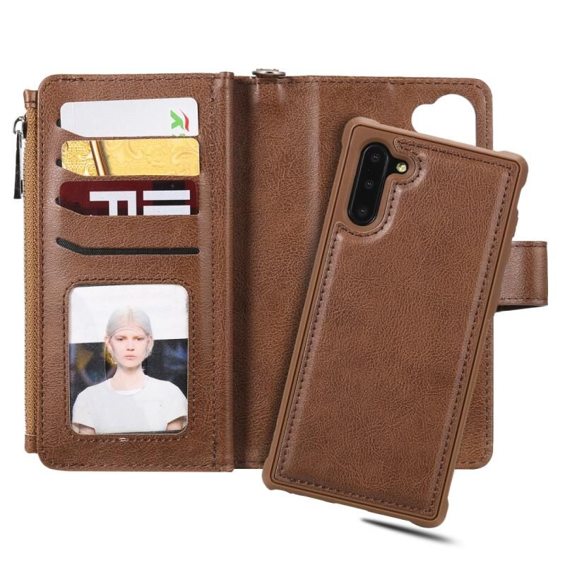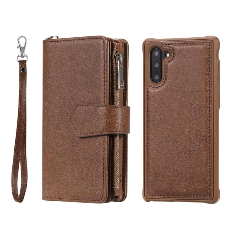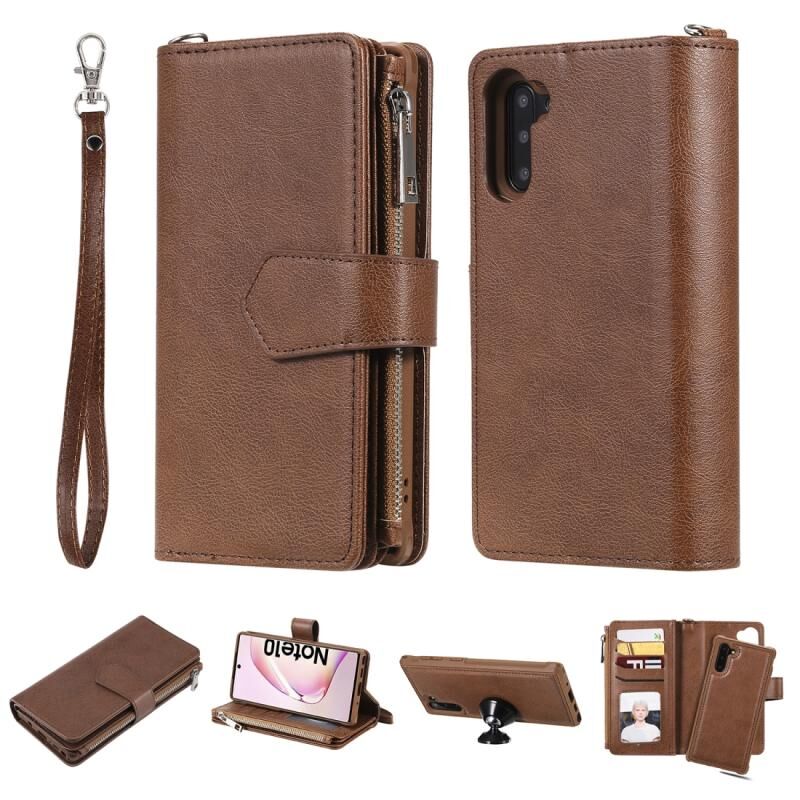 Για Galaxy Note 10 2 σε 1 Αμιγές χρώμα φερμουάρ Shockproof προστατευτική θήκη με υποδοχές για κάρτες & βραχίονα & φωτογραφική θήκη & λειτουργία πορτοφόλι (καφέ)