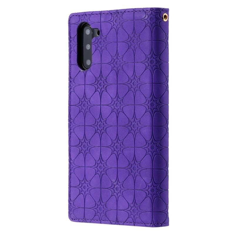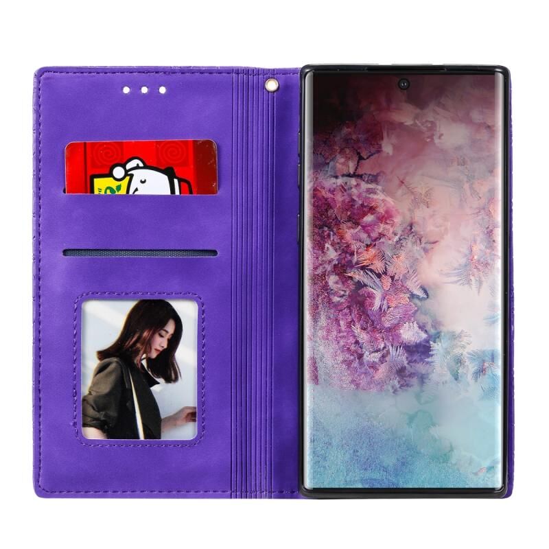 Θήκη δέρματος με μαγνητικό κλείσιμο, οριζόντια, με ανάγλυφο σχέδιο λουλουδιών για Galaxy Note 10, με βάση και θήκες για κάρτες (Μωβ)