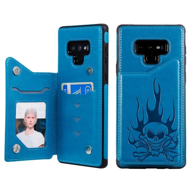 Θήκη προστασίας με ανάγλυφο σχέδιο κρανίου, αντικραδασμική για Galaxy Note9, με βάση στήριξης, θήκες καρτών και πορτοφόλι (Μπλε)