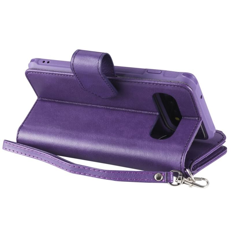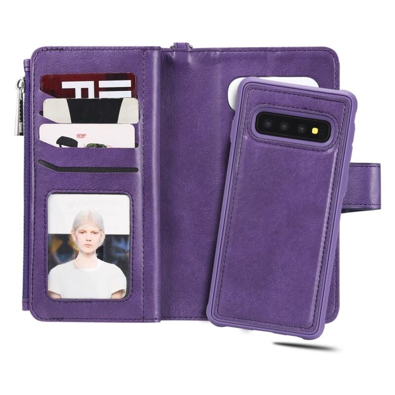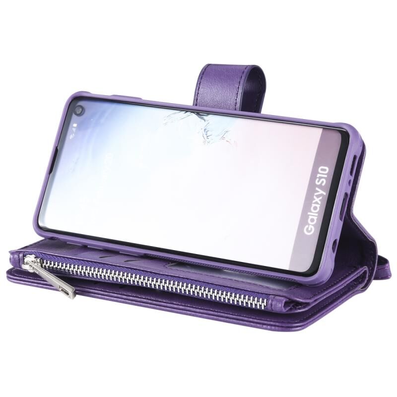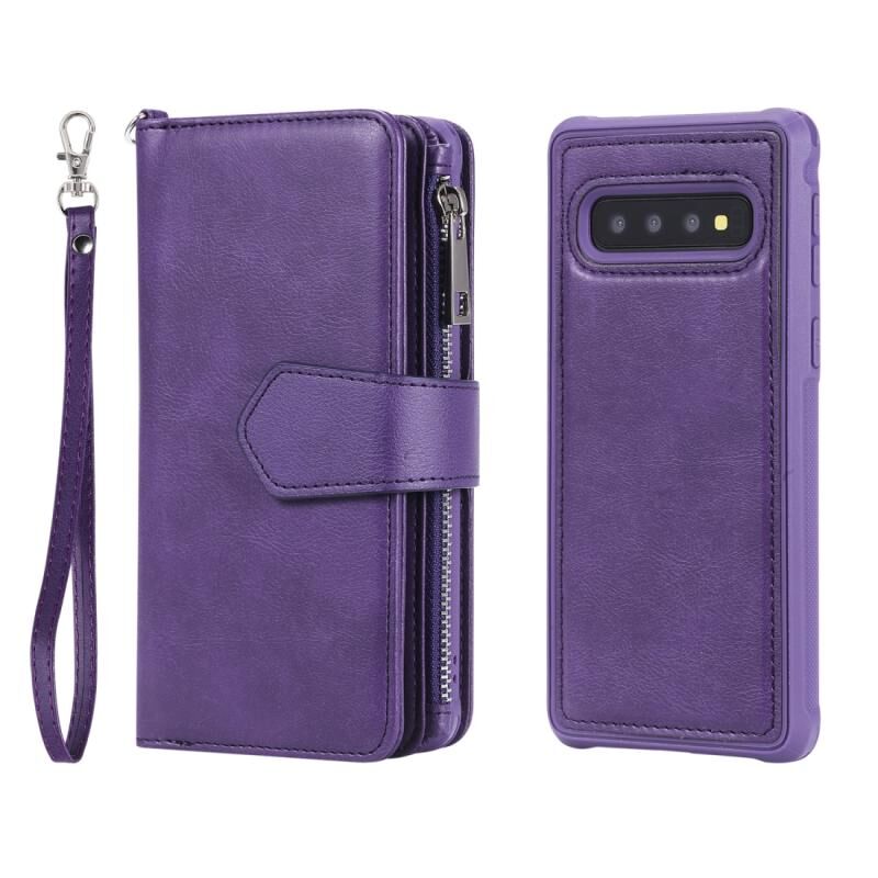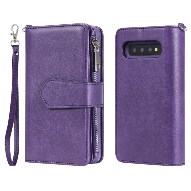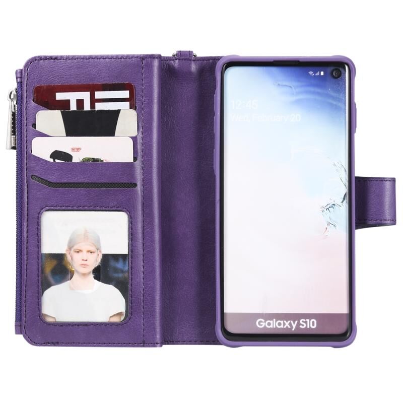 Για Galaxy S10 2 σε 1 Αμιγές χρώμα φερμουάρ Shockproof προστατευτική θήκη με υποδοχές για κάρτες & βραχίονα & φωτογραφική θήκη & λειτουργία πορτοφόλι (μωβ)