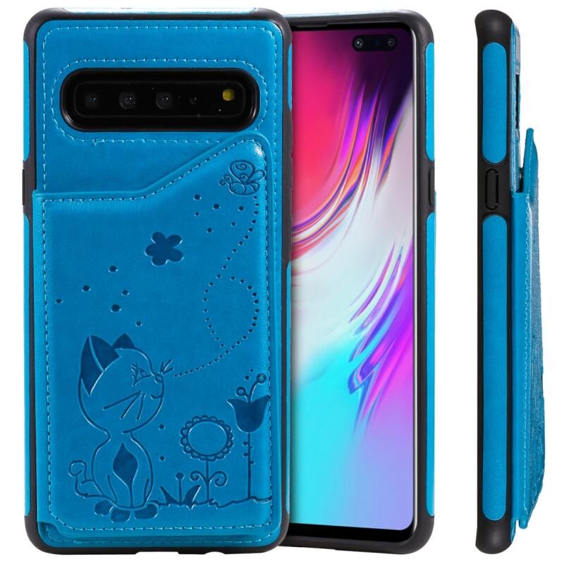 Θήκη προστασίας με ανάγλυφο σχέδιο Cat Bee για Galaxy S10 5G, ανθεκτική σε κρούσεις, με θήκες για κάρτες & κορνίζα φωτογραφιών (Μπλε)