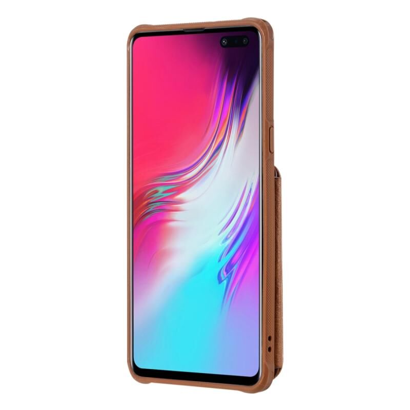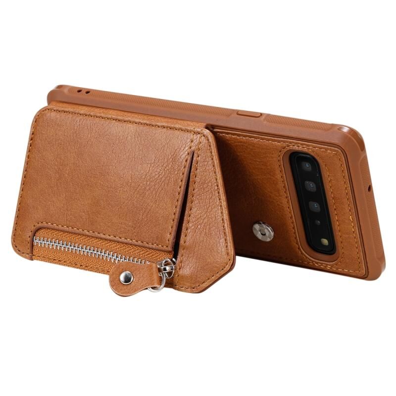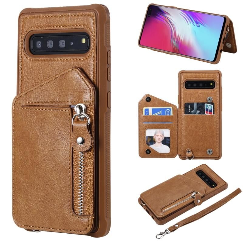 Για Galaxy S10 5G Διπλή πόρπες φερμουάρ Shockproof πίσω κάλυμμα προστατευτική θήκη με κάτοχο & υποδοχές για κάρτες & πορτοφόλι & κορδόνι & φωτογραφίες πλαίσια (καφέ)