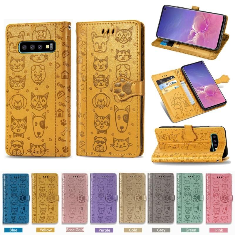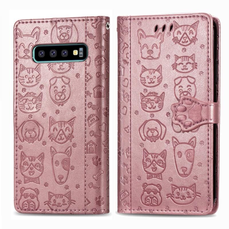 Θήκη δέρματος οριζόντιας αναδίπλωσης με ανάγλυφα σχέδια χαριτωμένων γάτας και σκύλου για Galaxy S10, με βάση στήριξης / υποδοχή κάρτας / πορτοφόλι / κορδόνι (Γκρι)