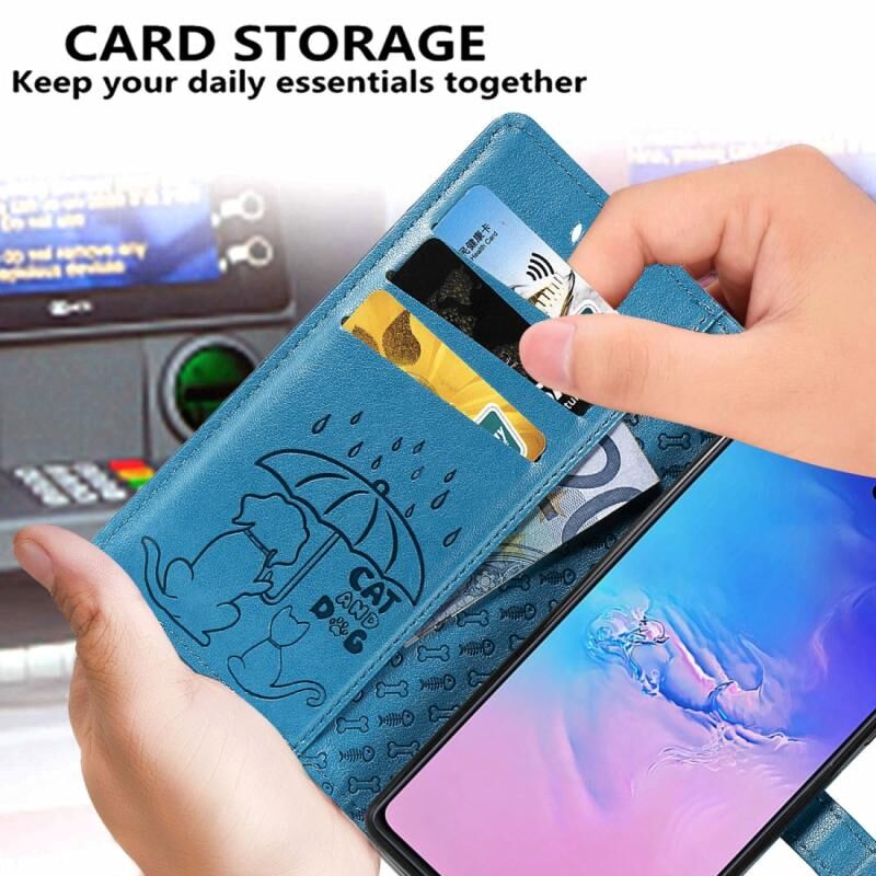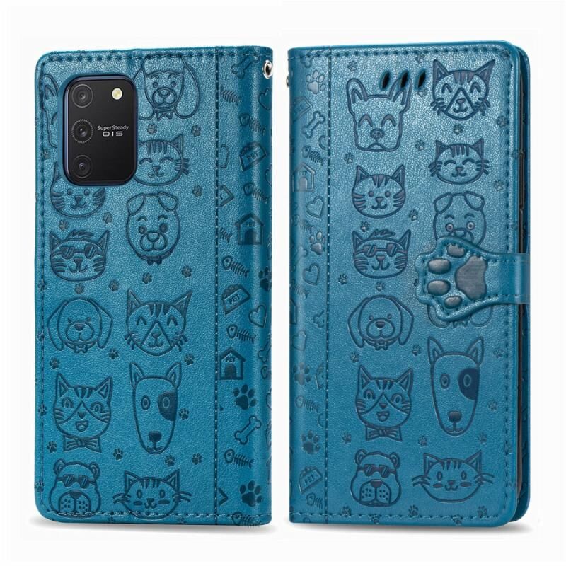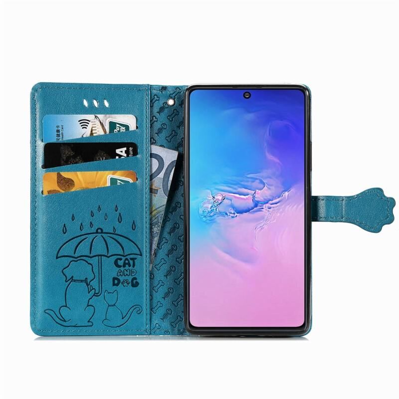 Θήκη δέρματος οριζόντιας αναδίπλωσης με ανάγλυφα σχέδια χαριτωμένων γάτας και σκύλου, με βάση στήριξης / υποδοχή κάρτας / πορτοφόλι / κορδόνι για Galaxy S10 Lite/A91 (Μπλε)