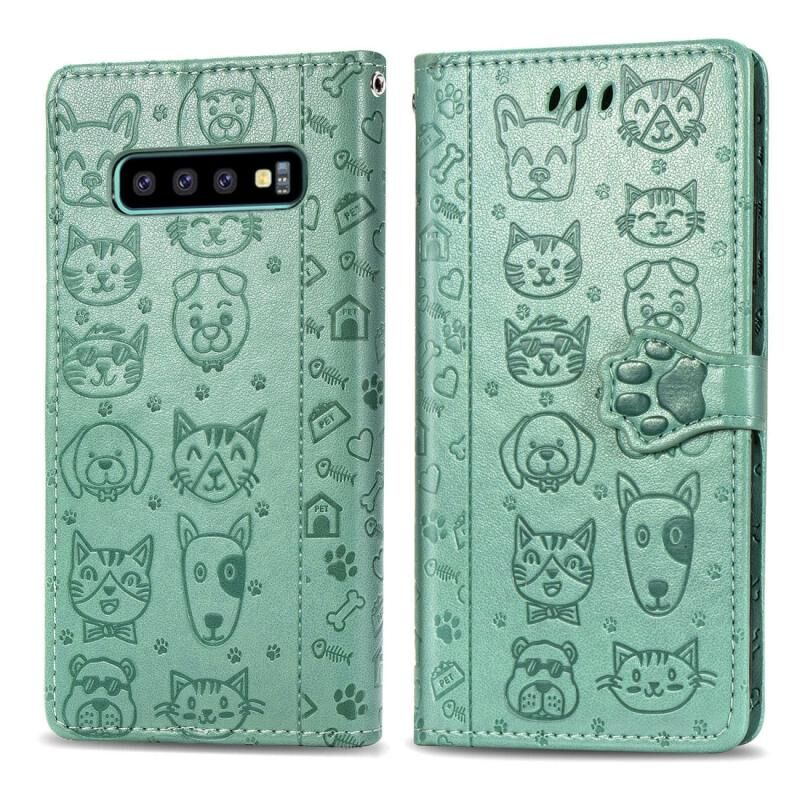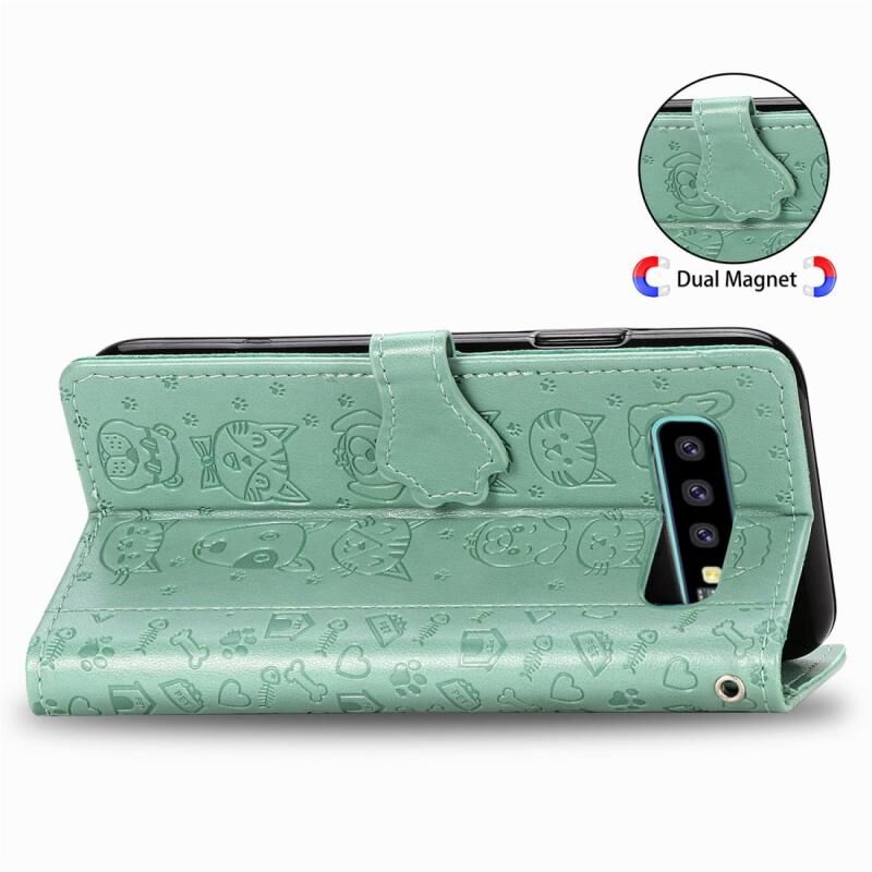 Θήκη δέρματος οριζόντιας αναδίπλωσης με ανάγλυφα σχέδια χαριτωμένων γάτας και σκύλου για Galaxy S10 Plus, με βάση / υποδοχή κάρτας / πορτοφόλι / κορδόνι (Κίτρινο)