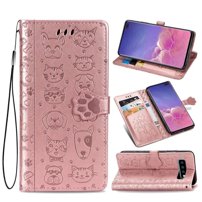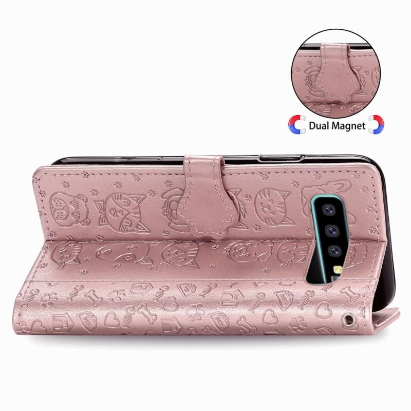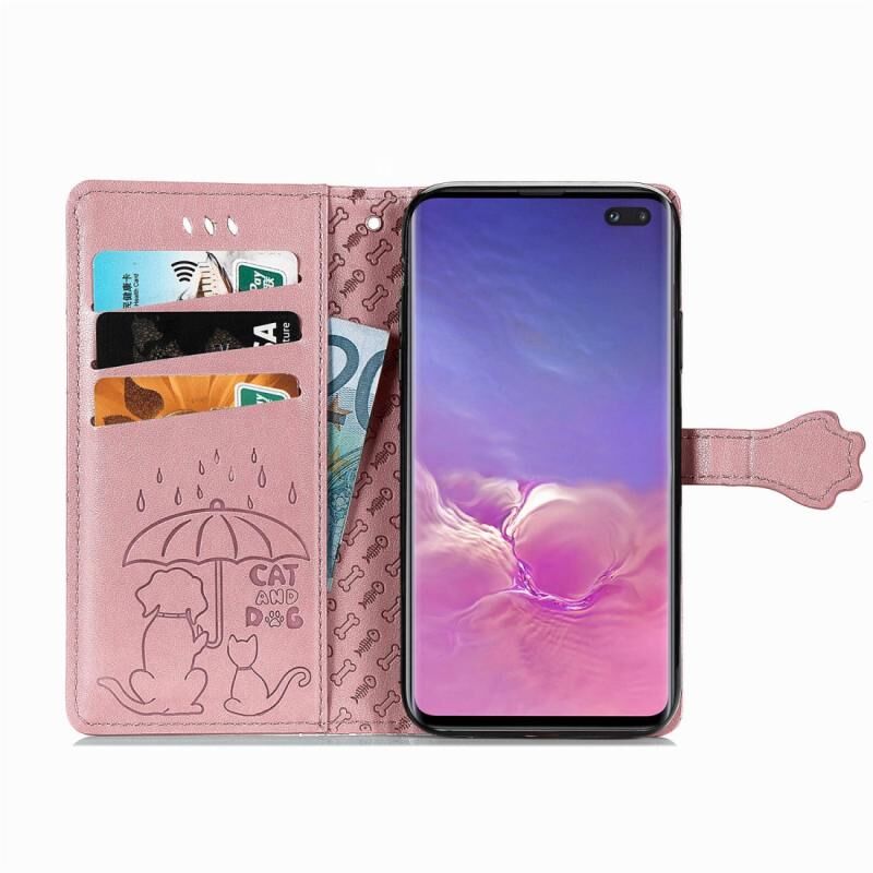 Θήκη δέρματος οριζόντιας αναδίπλωσης με ανάγλυφα σχέδια χαριτωμένων γάτας και σκύλου για Galaxy S10 Plus, με βάση στήριξης / υποδοχή κάρτας / πορτοφόλι / κορδόνι (Ροζ)