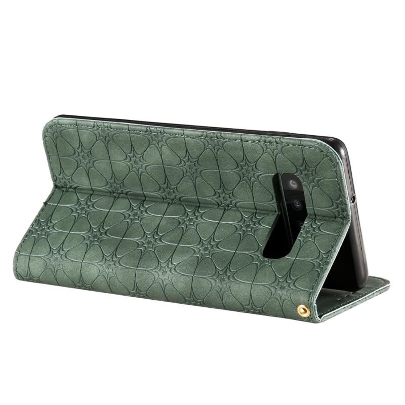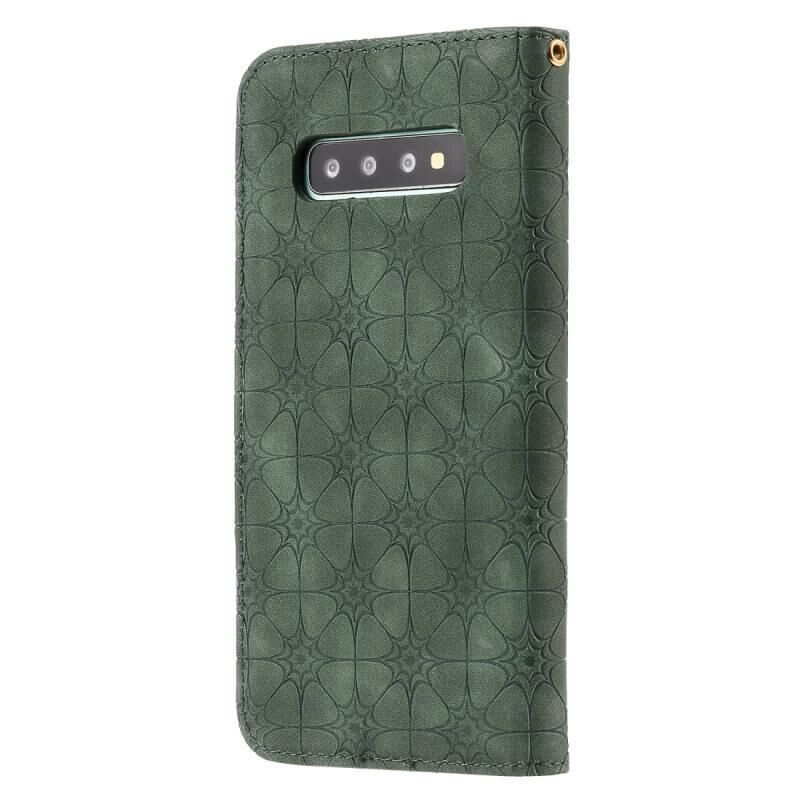 Θήκη δέρματος με μαγνητικό κλείσιμο, οριζόντια, με ανάγλυφο σχέδιο τυχερών λουλουδιών για Samsung Galaxy S10 Plus, με βάση και θήκες για κάρτες (Σκούρο πράσινο)