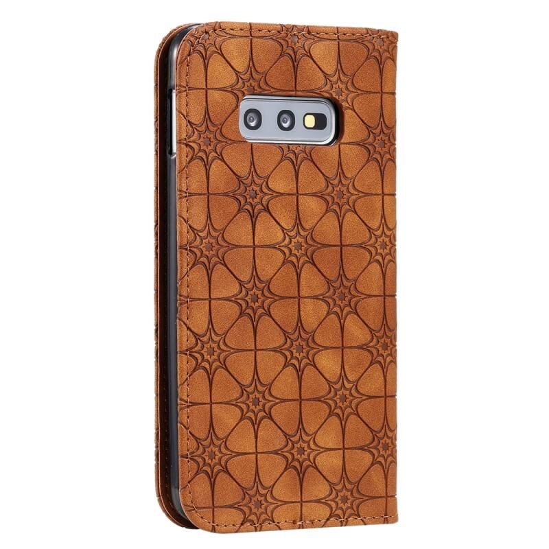 Θήκη δέρματος με μαγνητικό κλείσιμο, οριζόντια, με ανάγλυφο σχέδιο τυχερών λουλουδιών για Samsung Galaxy S10e, με βάση και θήκες για κάρτες (Σκούρο Μπλε)