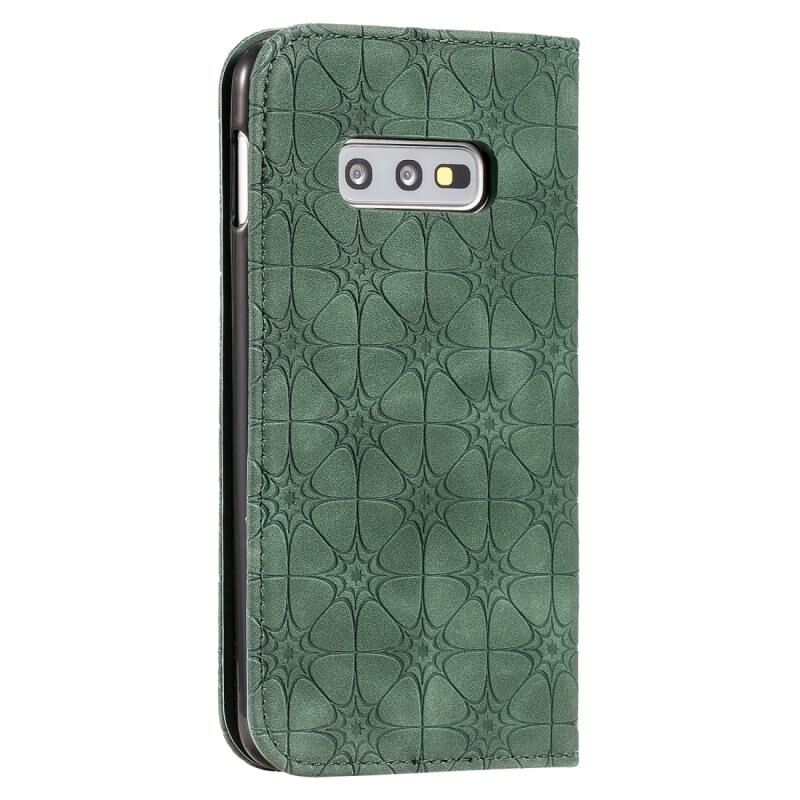 Θήκη δέρματος με μαγνητικό κλείσιμο, οριζόντια, με ανάγλυφο σχέδιο τυχερών λουλουδιών για Samsung Galaxy S10e, με βάση και θήκες για κάρτες (Μωβ)