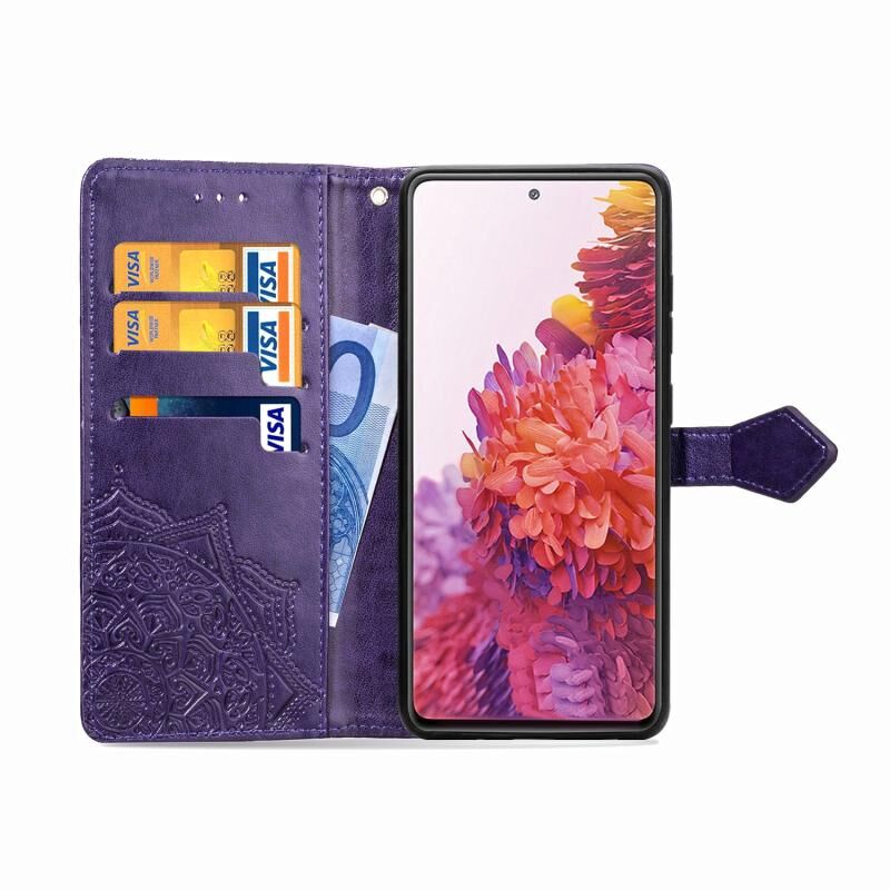 Θήκη δέρματος οριζόντιας αναδίπλωσης με ανάγλυφο σχέδιο μαντάλας και λουλουδιών για Galaxy S20 FE / S20 Lite, με βάση στήριξης / υποδοχή κάρτας / πορτοφόλι / κορδόνι (Μαύρο)