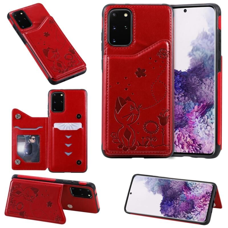 Θήκη προστασίας με ανάγλυφο σχέδιο Cat Bee για Galaxy S20 Plus, ανθεκτική σε κρούσεις, με θήκες για κάρτες & κορνίζα φωτογραφιών (Κόκκινο)