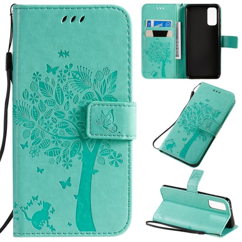 Θήκη για Galaxy S20 με σχέδιο δέντρου & γάτας, με ανάγλυφη εκτύπωση, οριζόντια, από δερματίνη PU με βάση στήριξης & θήκες για κάρτες & πορτοφόλι & κορδόνι (Πράσινο)