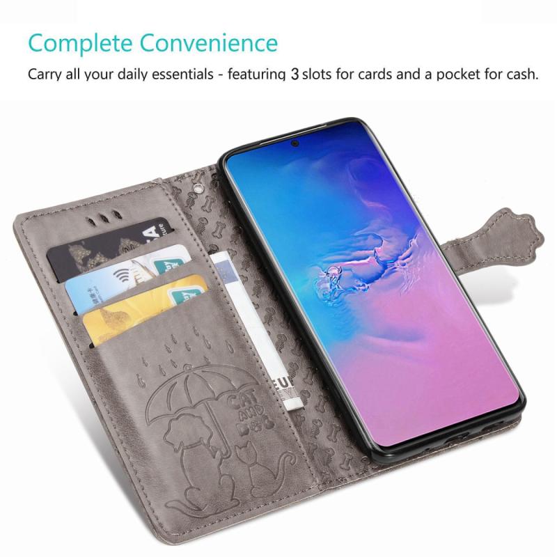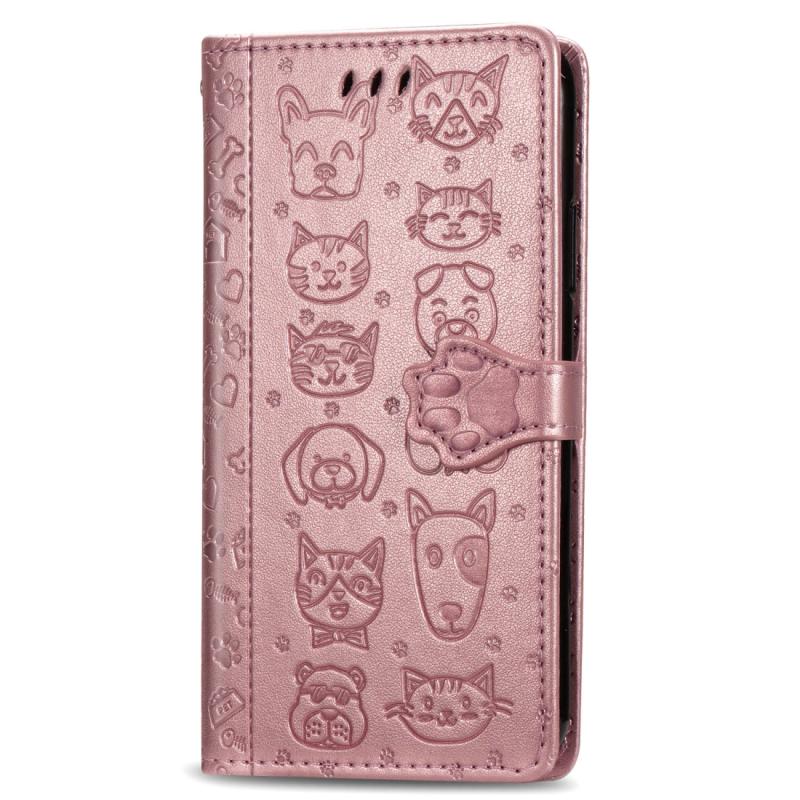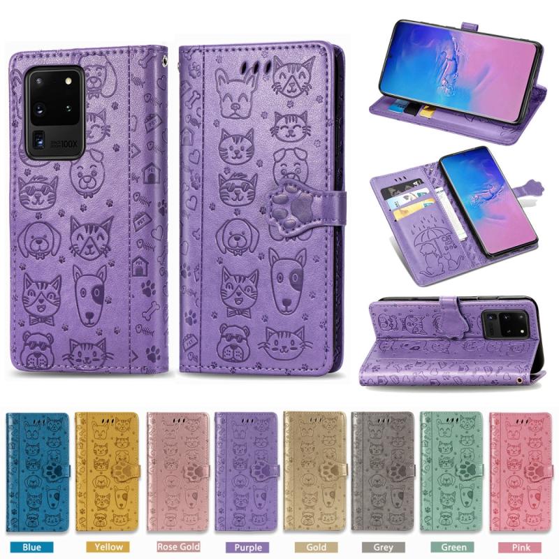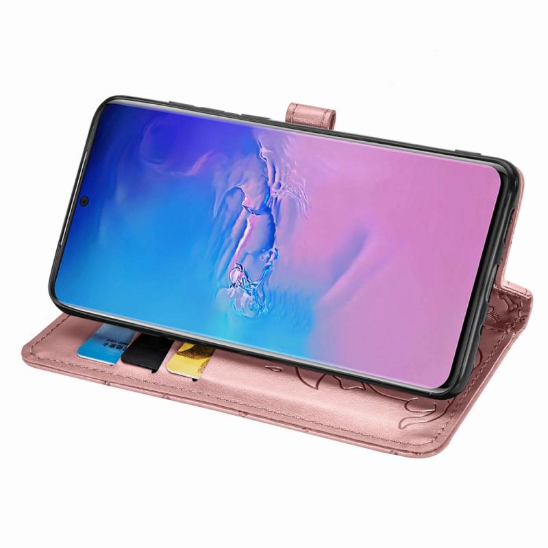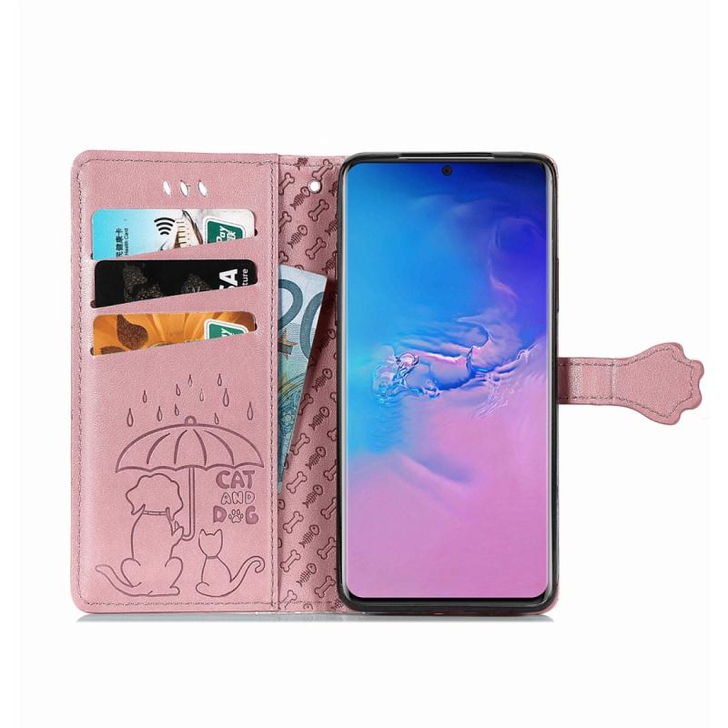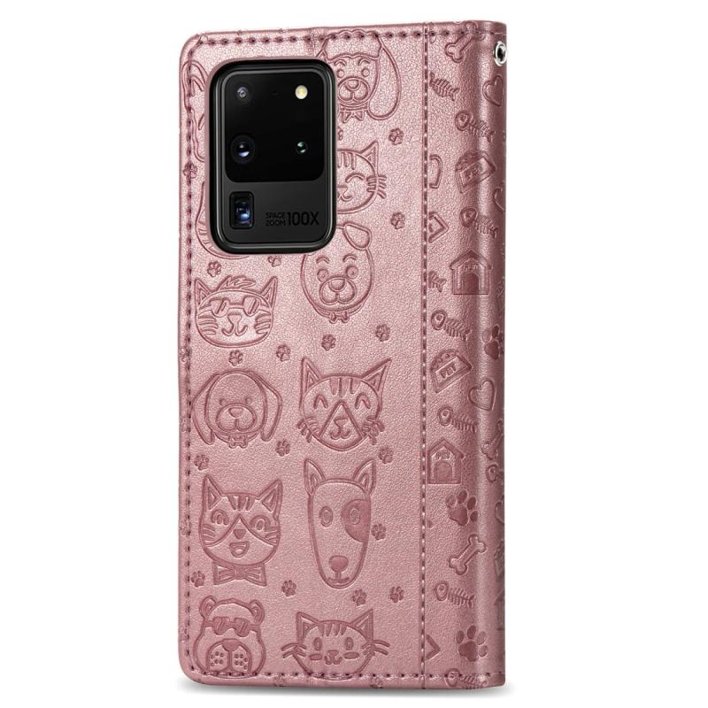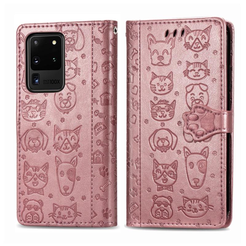 Θήκη οριζόντιας αναδίπλωσης από δερματίνη PU με ανάγλυφα σχέδια χαριτωμένων γάτας και σκύλου για Galaxy S20 Ultra, με βάση / υποδοχή κάρτας / πορτοφόλι / κορδόνι (Ροζ χρυσός)