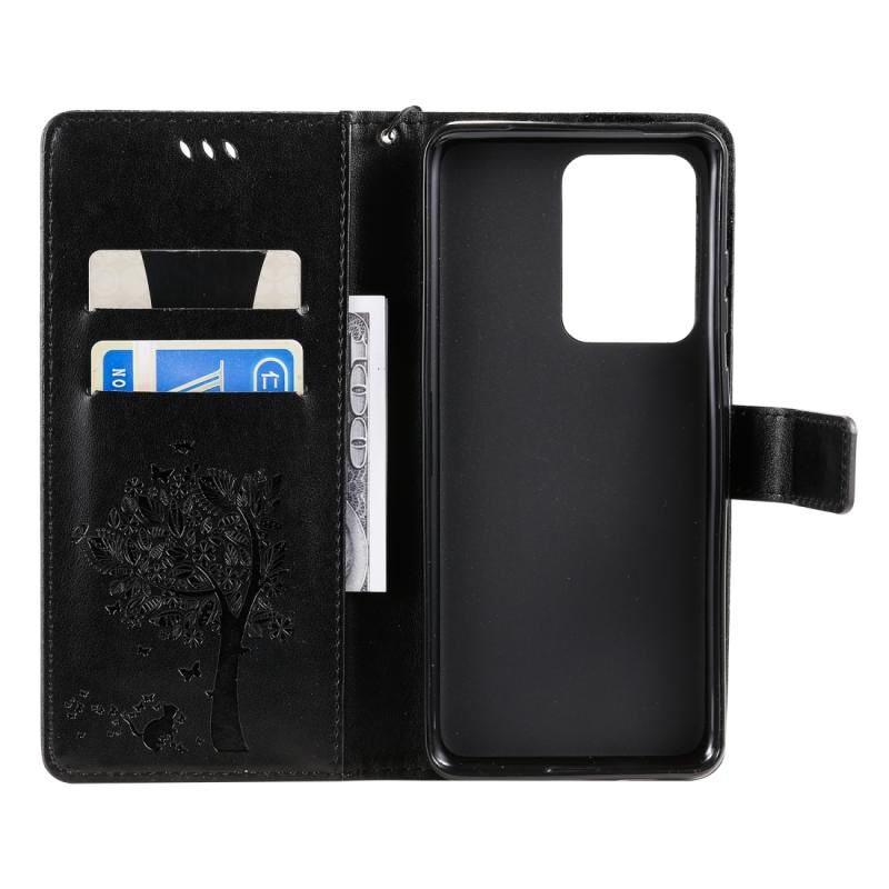 Θήκη για Galaxy S20 Ultra με σχέδιο Δέντρου & Γάτας, εκτυπωμένη με θερμοτύπηση, οριζόντια, από δερματίνη PU με βάση στήριξης & θήκες για κάρτες & πορτοφόλι & κορδόνι (Χρυσό Ρόδι)