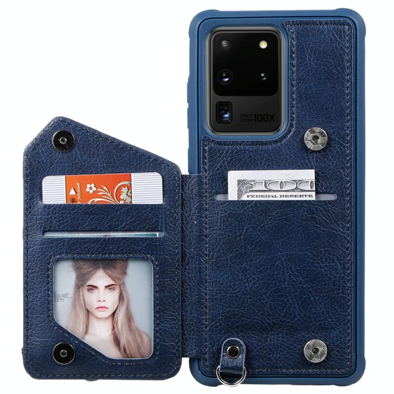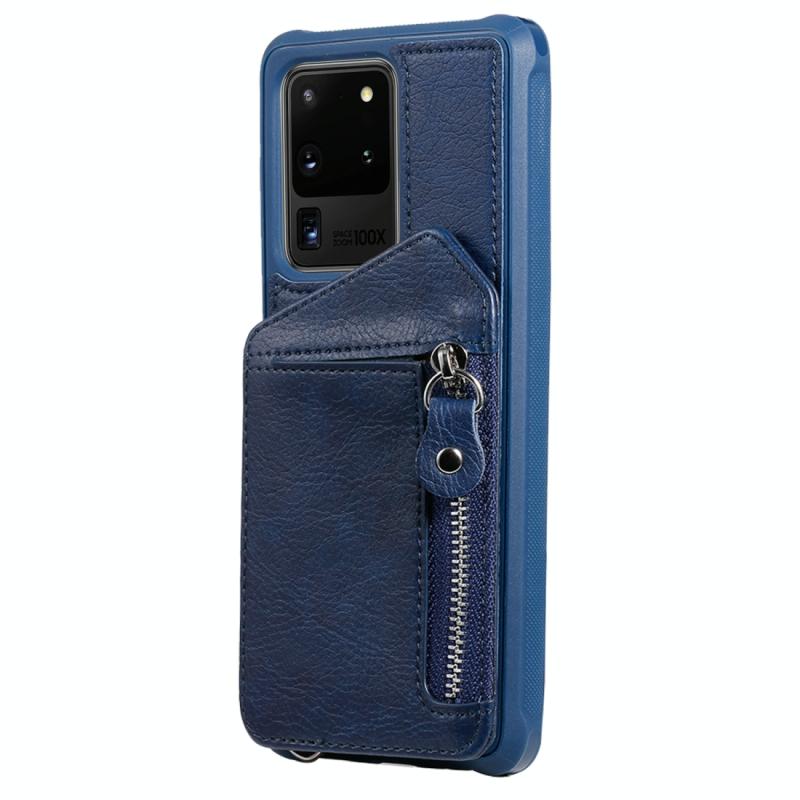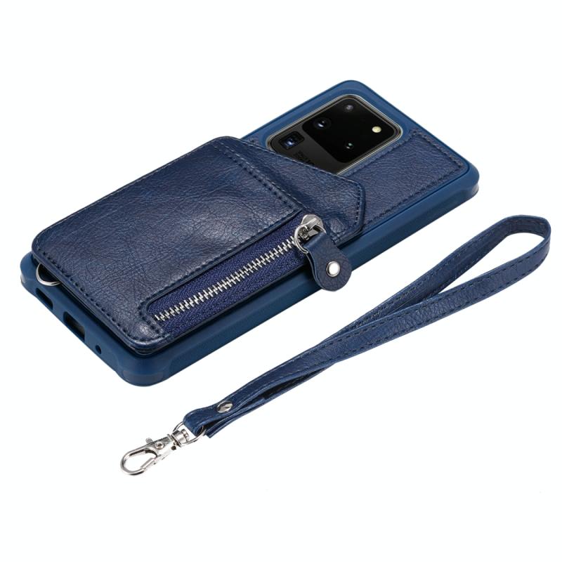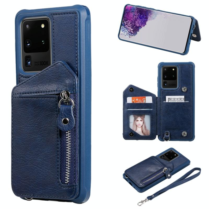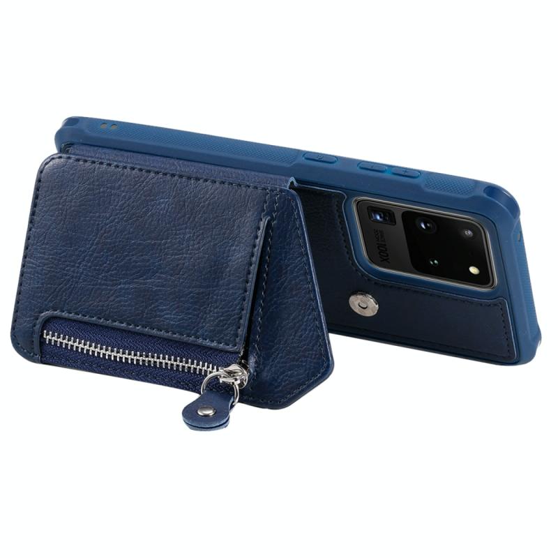 Θήκη προστασίας με φερμουάρ και διπλή αγκράφα για Galaxy S20 Ultra, ανθεκτική σε κρούσεις, με βάση στήριξης, θήκη φωτογραφιών και λειτουργία πορτοφολιού (Μπλε)
