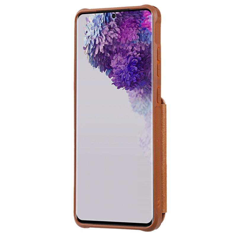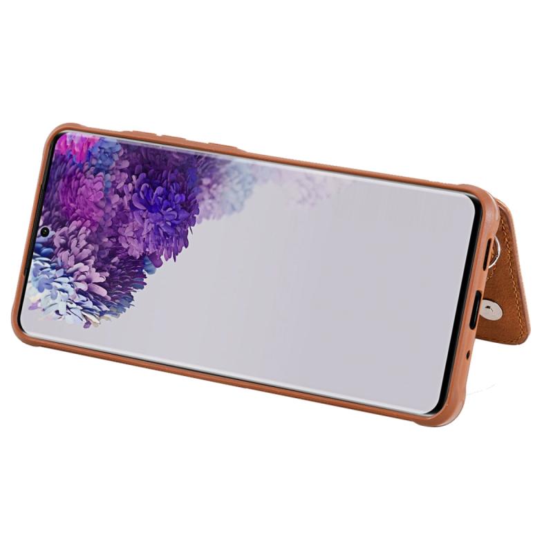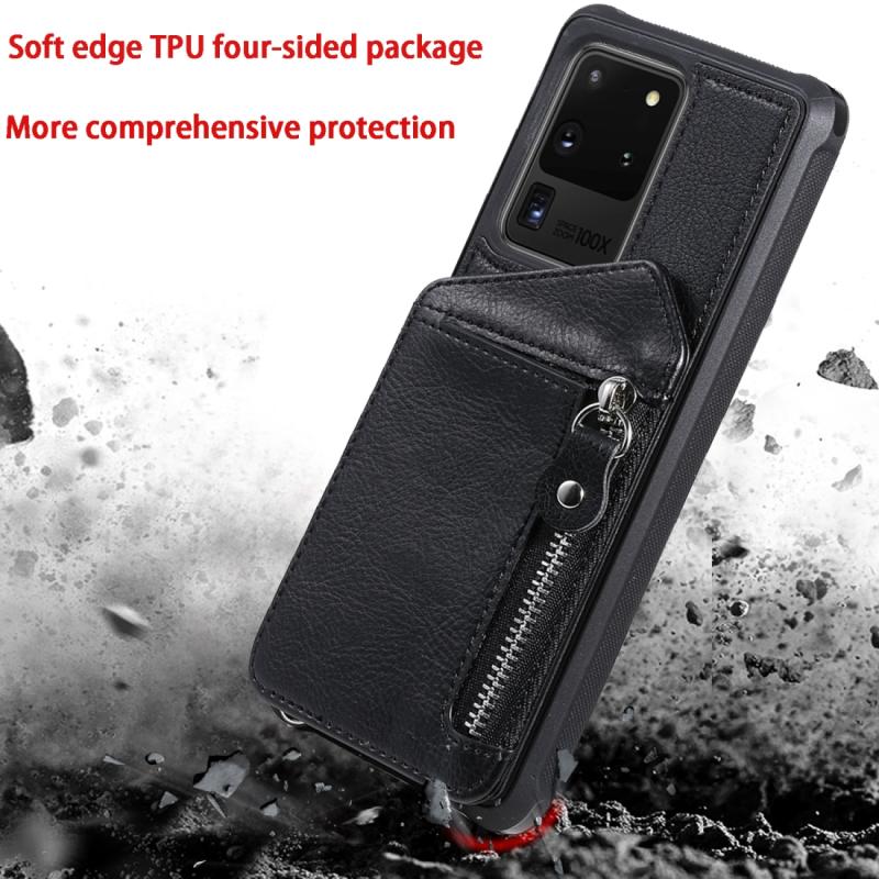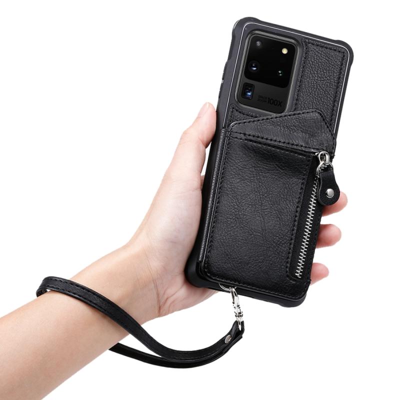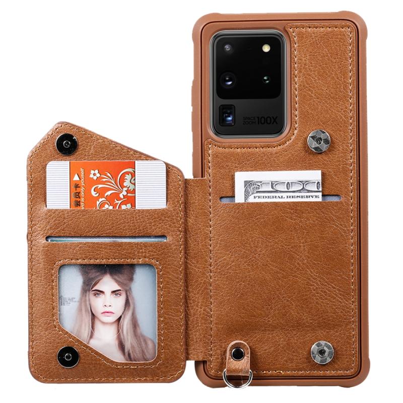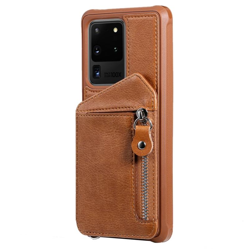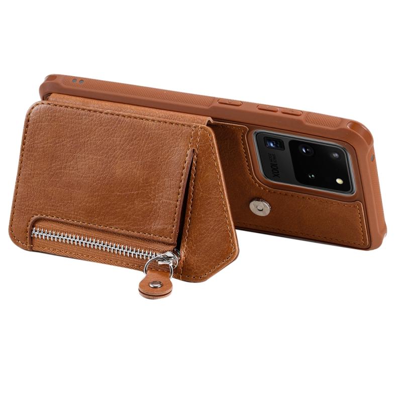 Θήκη προστασίας με φερμουάρ και διπλή αγκράφα για Galaxy S20 Ultra, ανθεκτική σε κρούσεις, με βάση στήριξης, θήκη φωτογραφιών και λειτουργία πορτοφολιού (Καφέ)