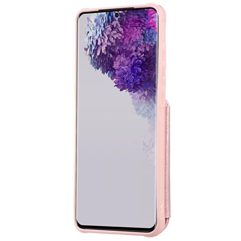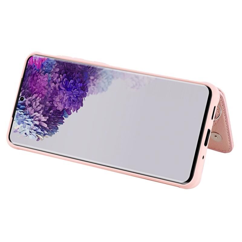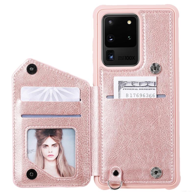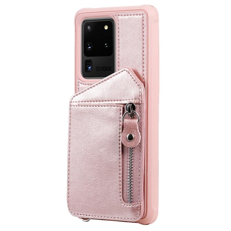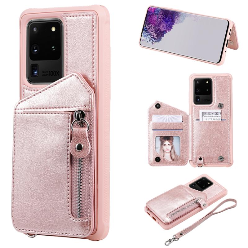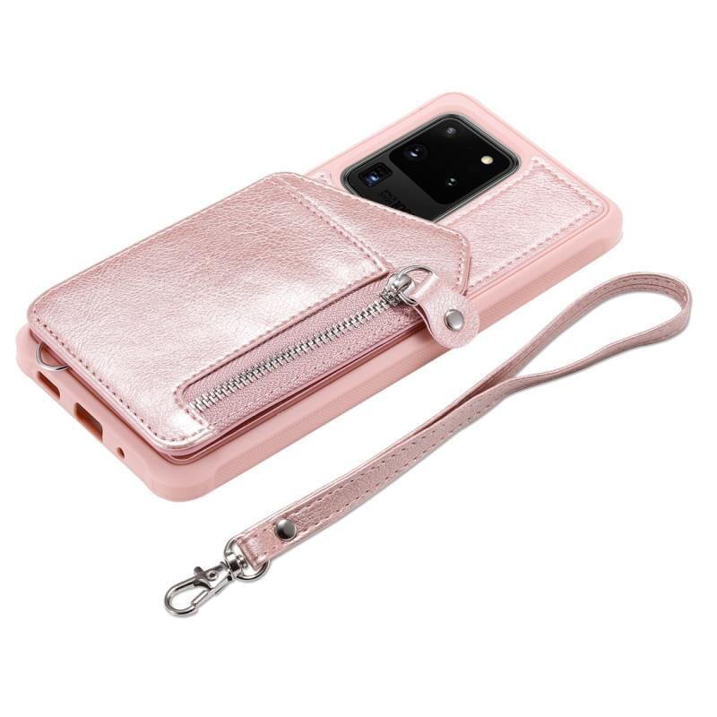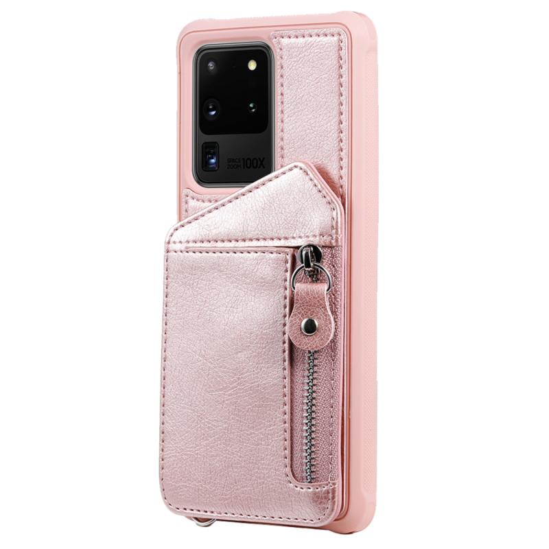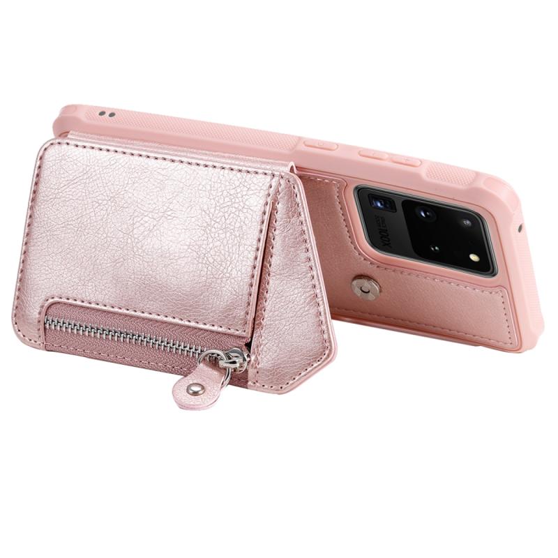 Θήκη προστασίας με φερμουάρ και διπλή αγκράφα για Galaxy S20 Ultra, ανθεκτική σε κρούσεις, με βάση στήριξης, θήκη φωτογραφιών και λειτουργία πορτοφολιού (Ροζ χρυσός)