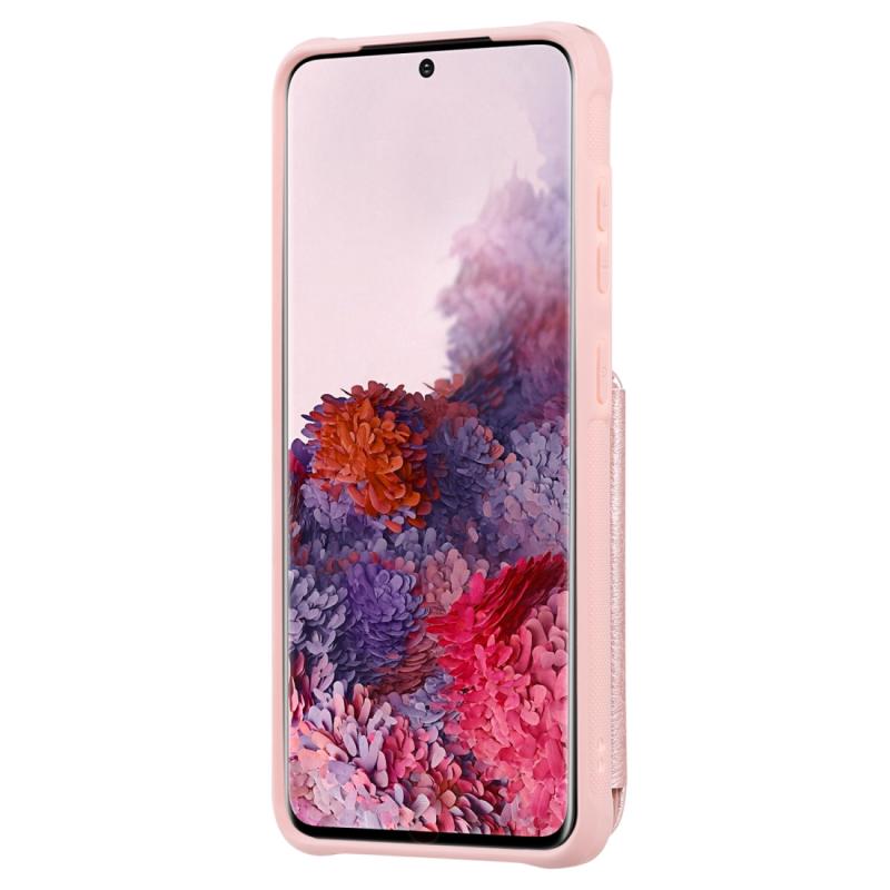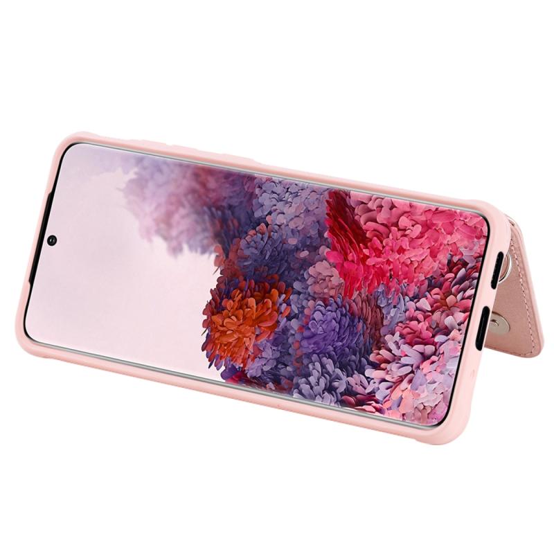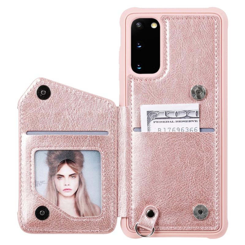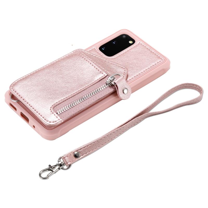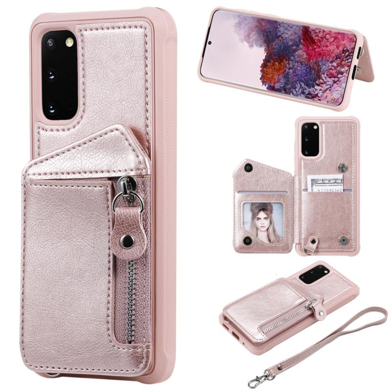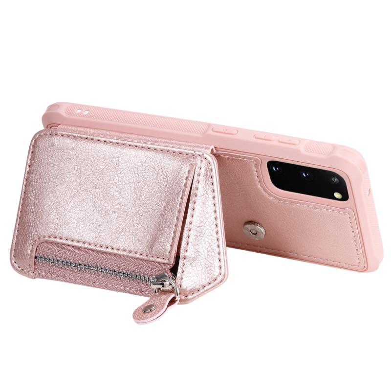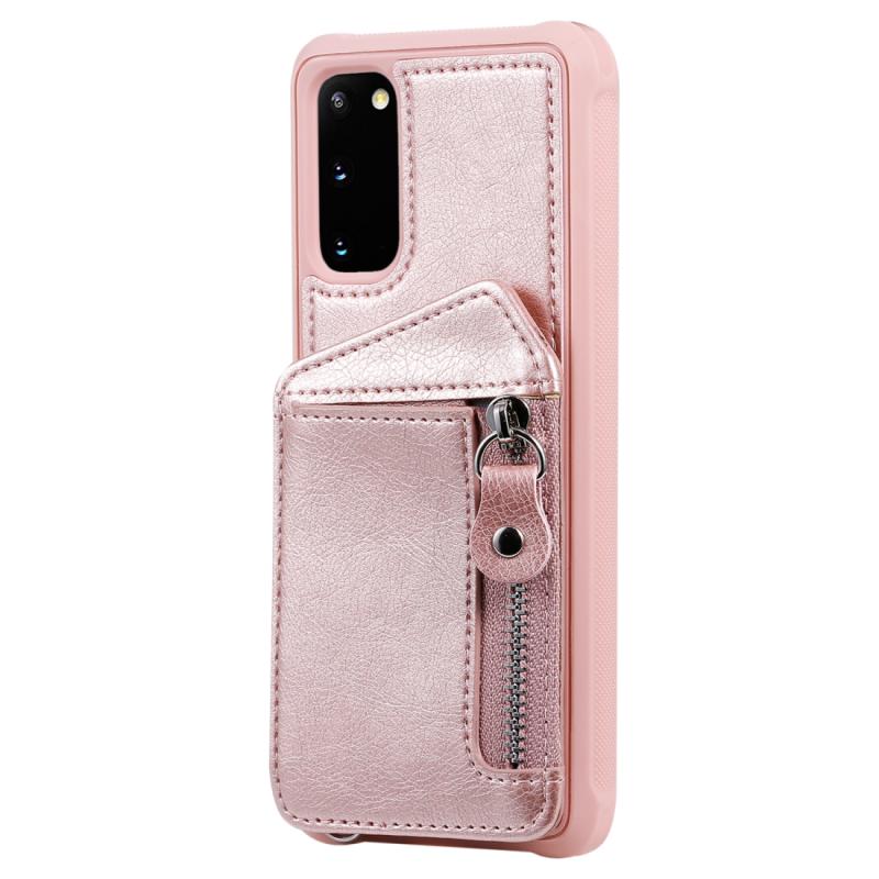 Θήκη προστασίας με φερμουάρ και διπλή αγκράφα για Galaxy S20, ανθεκτική σε κρούσεις, με βάση στήριξης, θήκη φωτογραφιών και λειτουργία πορτοφολιού (Ροζ χρυσός)