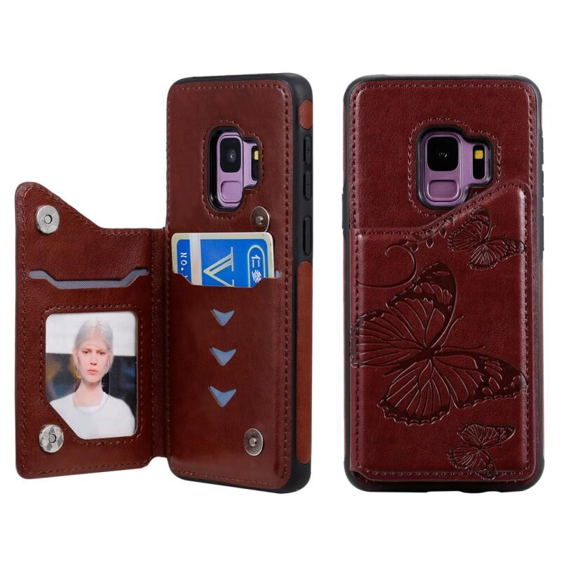 Θήκη προστασίας με ανάγλυφο σχέδιο πεταλούδας για Galaxy S9, ανθεκτική σε κρούσεις, με βάση στήριξης, θήκες για κάρτες & κορνίζα φωτογραφιών (Καφέ)