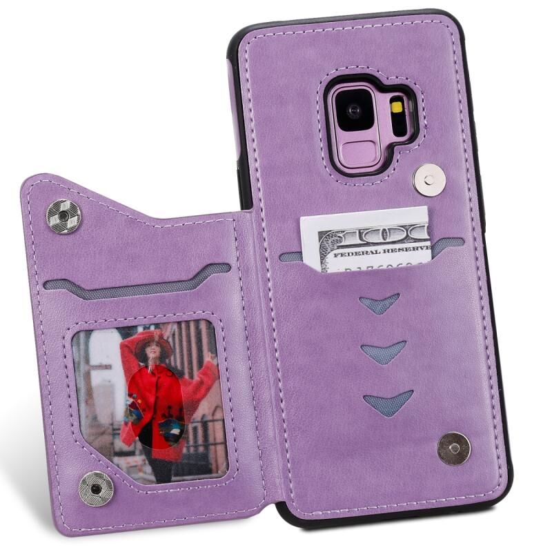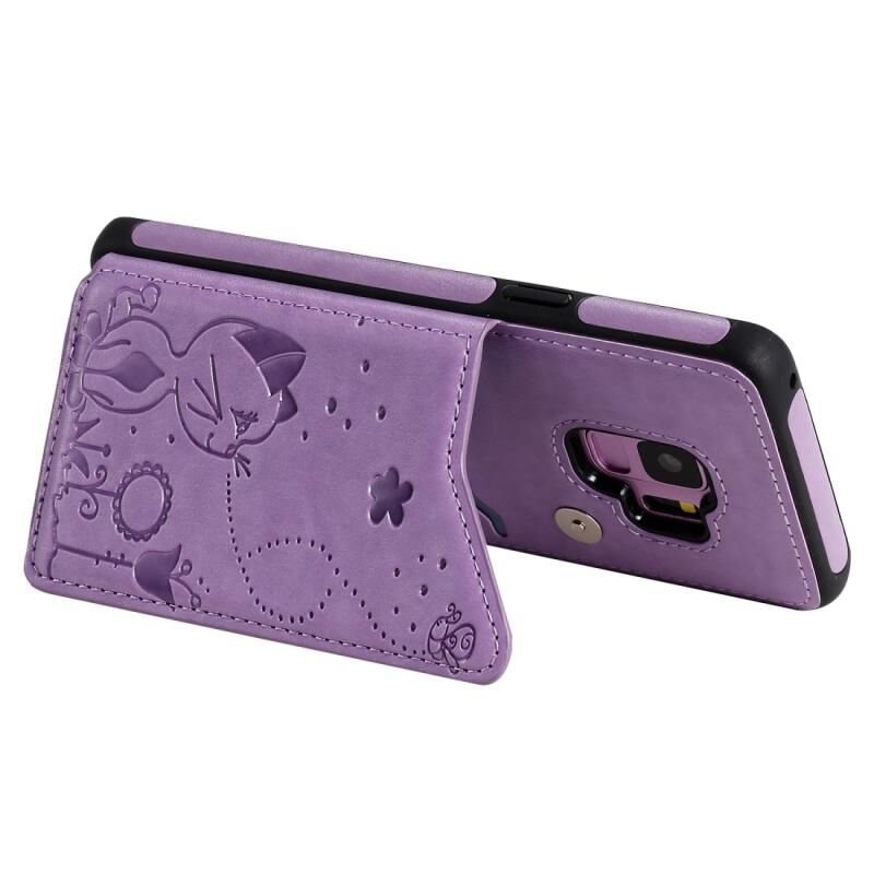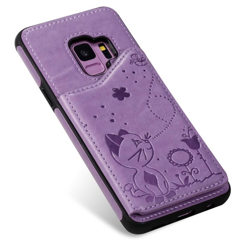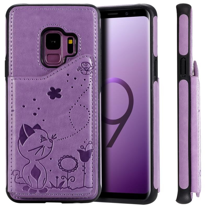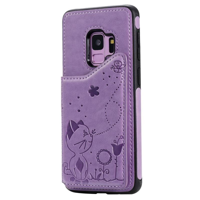 Θήκη προστασίας με ανάγλυφο σχέδιο Cat Bee για Galaxy S9, ανθεκτική στις κρούσεις, με θήκες για κάρτες & κορνίζα φωτογραφιών (Μωβ)
