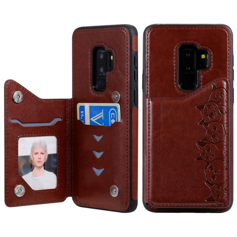 Θήκη προστασίας με ανάγλυφο σχέδιο έξι γατών για Galaxy S9+ με βάση στήριξης & θήκες καρτών & κορνίζα φωτογραφιών (Καφέ)