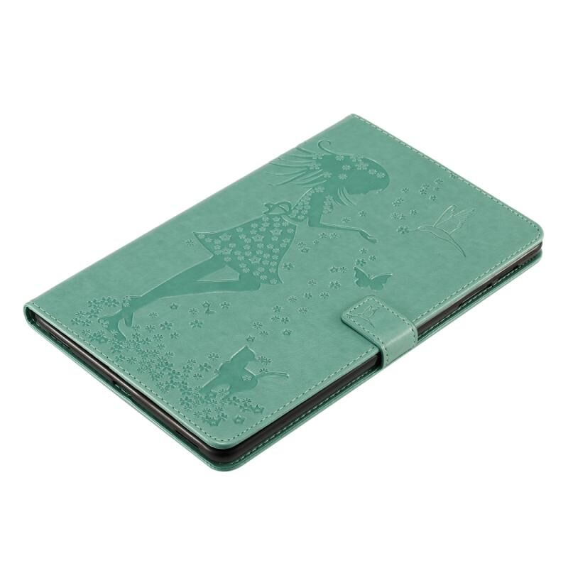 Για Galaxy Tab A 10.1 (2019) Θήκη δέρματος οριζόντιας αναδίπλωσης με σχέδιο γυναίκας και γάτας, με εκτύπωση υπό πίεση, με βάση στήριξης & υποδοχές καρτών & πορτοφόλι (Πράσινο)