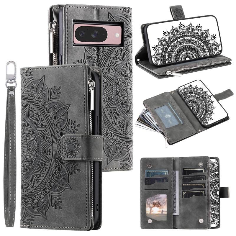 For Google Pixel 10 Multi-Card Totem Zipper Leather Phone Case(Grey)