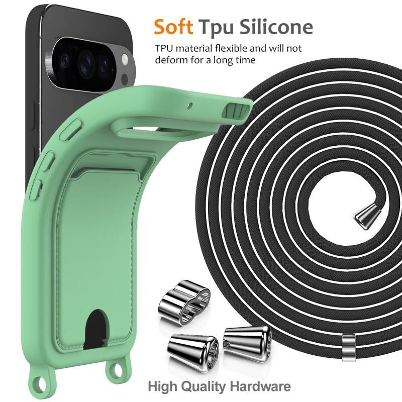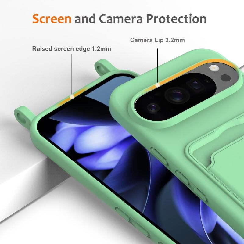 For Google Pixel 10 Pro XL Integrated Card Bag Solid Color Liquid Silicone Phone Case with Lanyard(Green)