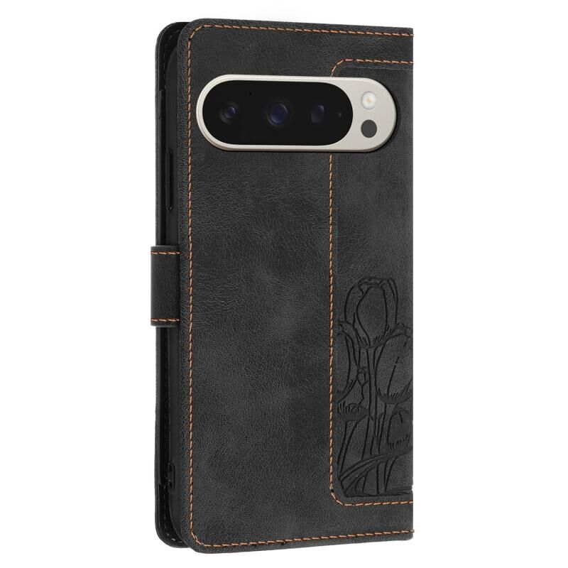 For Google Pixel 10 Pro XL Tulips Embossed Leather Phone Case with Lanyard(Black)