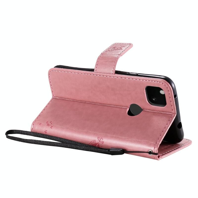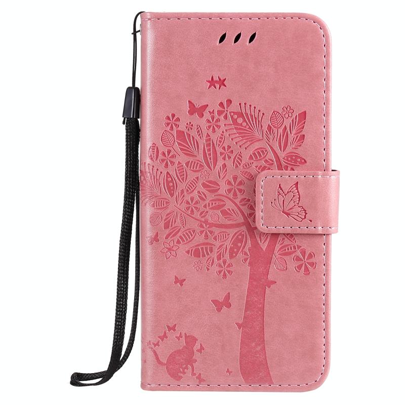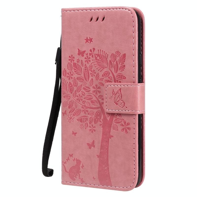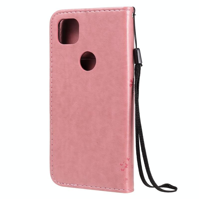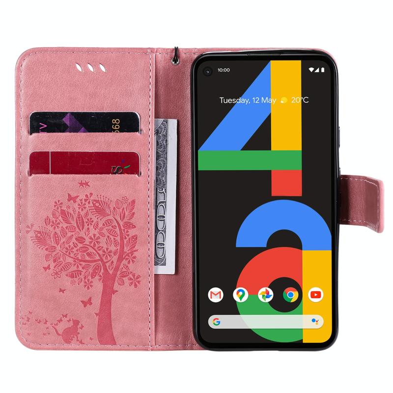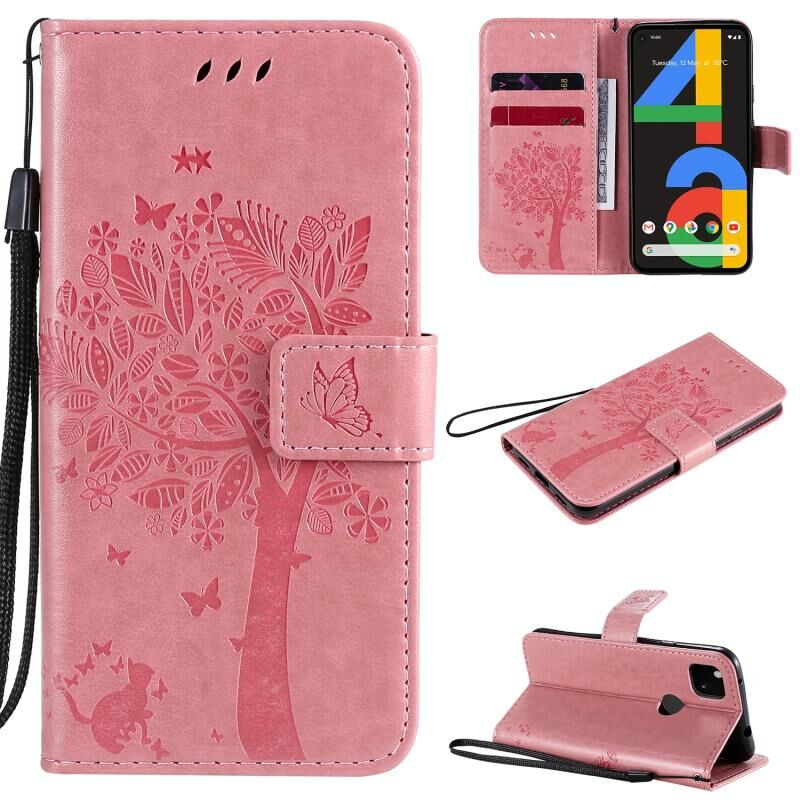 For Google Pixel 4a 4G Tree & Cat Embossed Pattern Horizontal Flip Leather Case with Holder & Card Slots & Wallet & Lanyard(Pink)