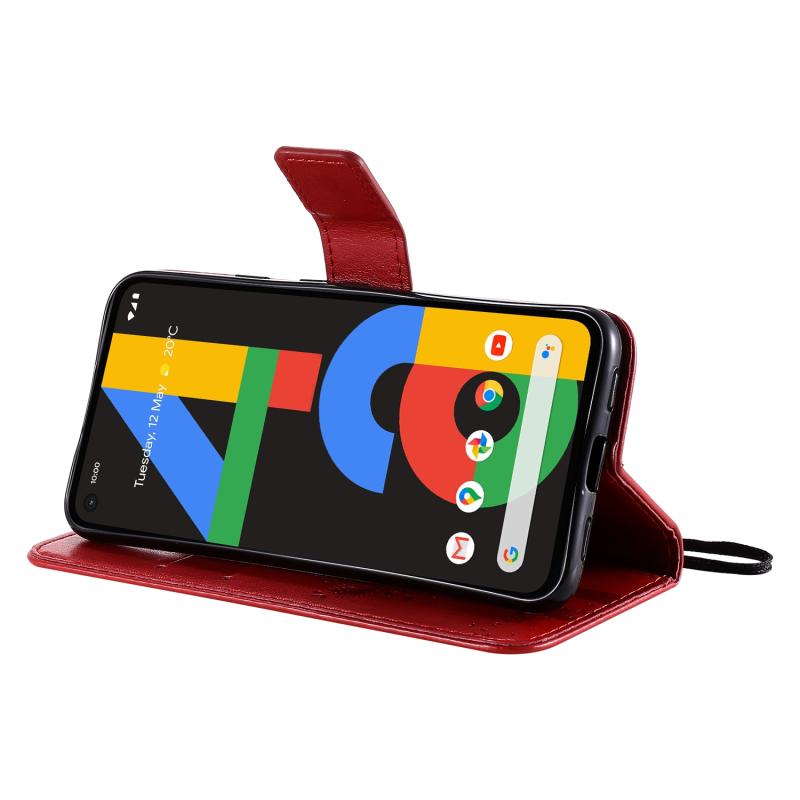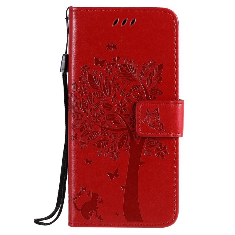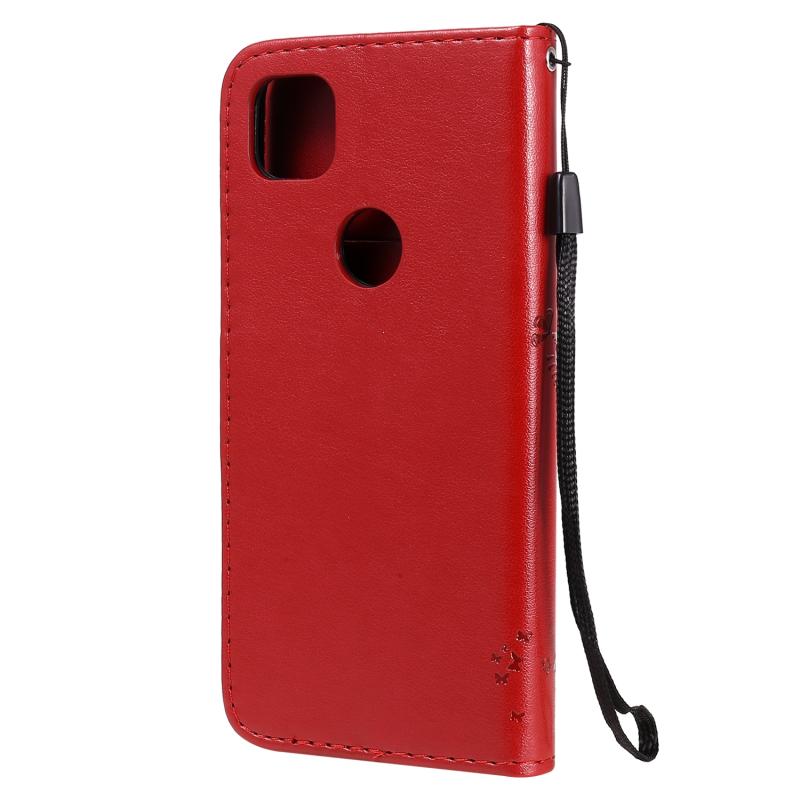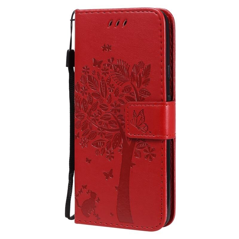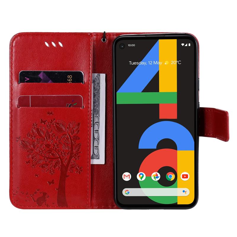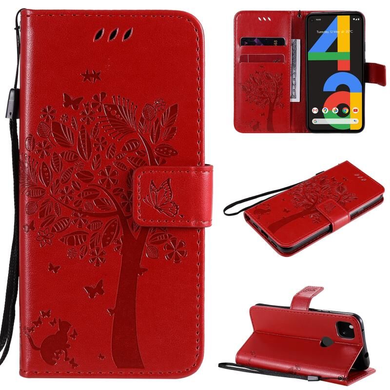 For Google Pixel 4a 4G Tree & Cat Embossed Pattern Horizontal Flip Leather Case with Holder & Card Slots & Wallet & Lanyard(Red)