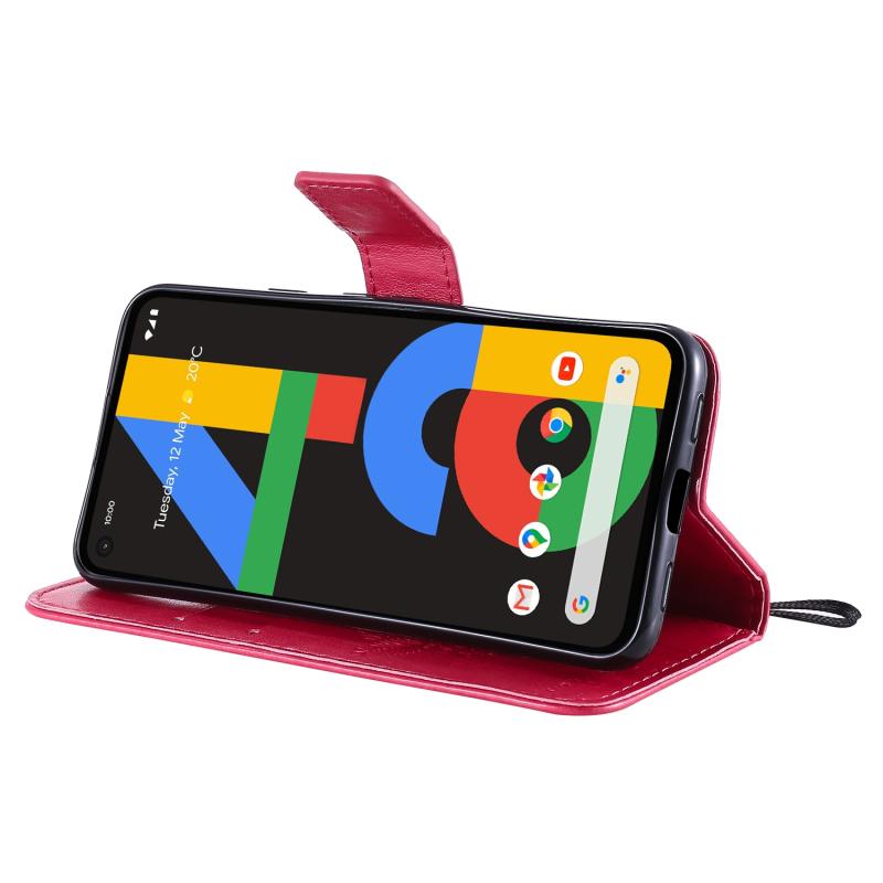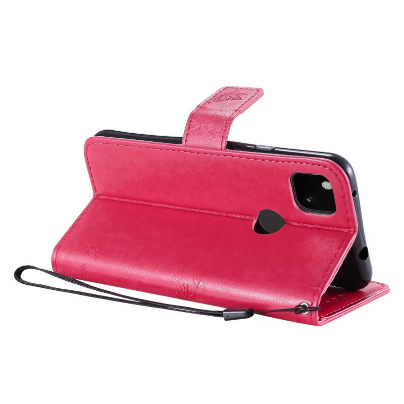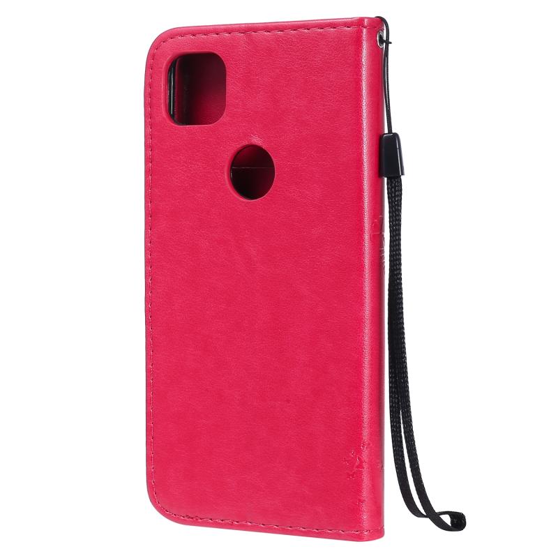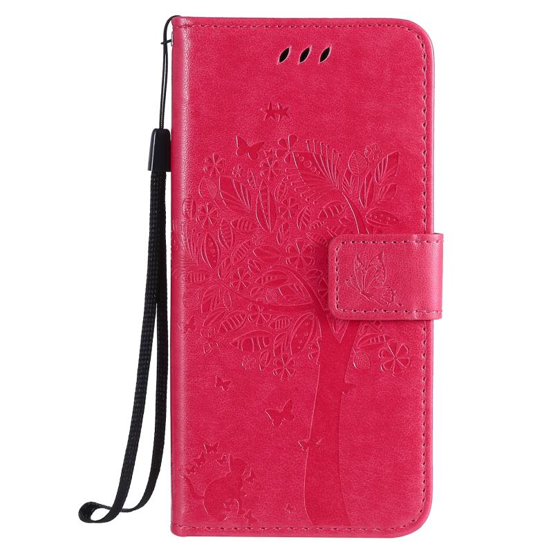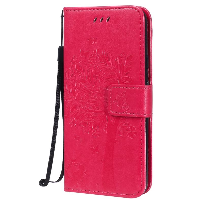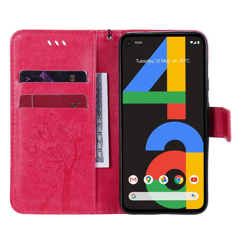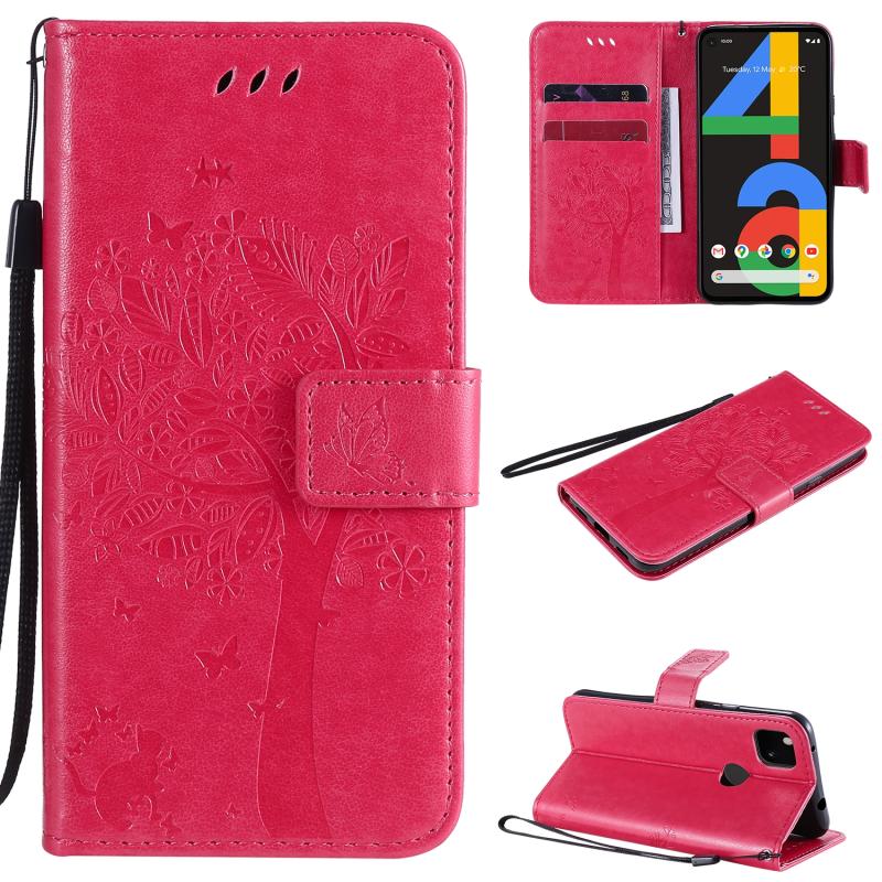 Θήκη δέρματος οριζόντιας αναδίπλωσης για Google Pixel 4a 4G με ανάγλυφο σχέδιο δέντρου & γάτας, με βάση στήριξης & θήκες καρτών & πορτοφόλι & κορδόνι (Ροζέ κόκκινο)