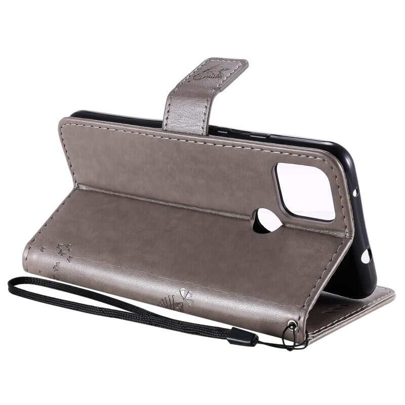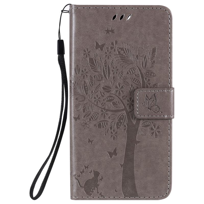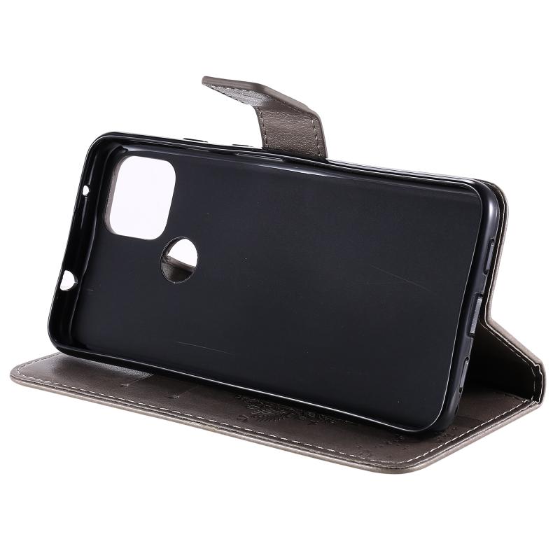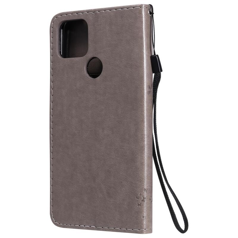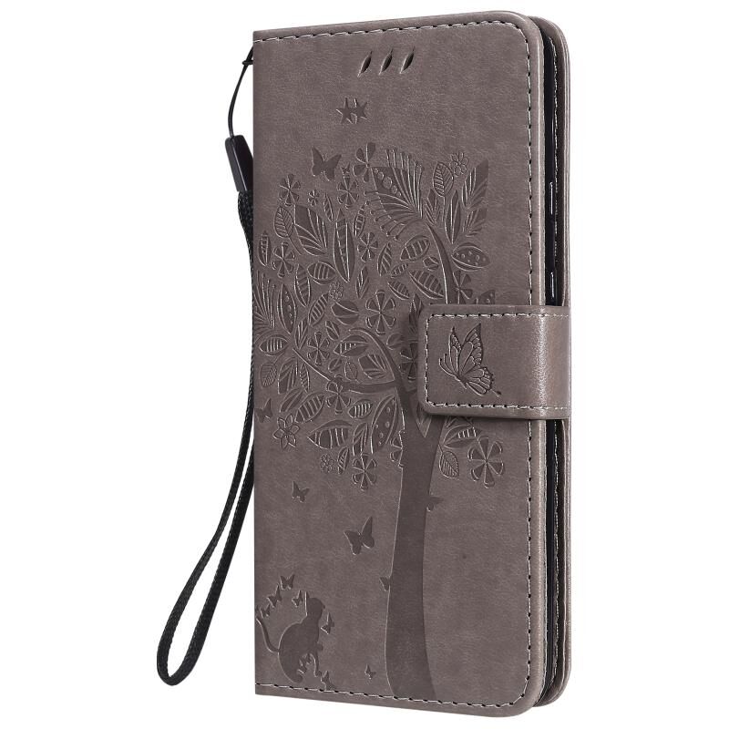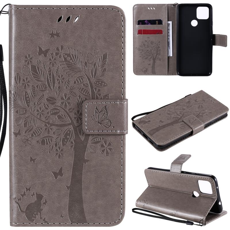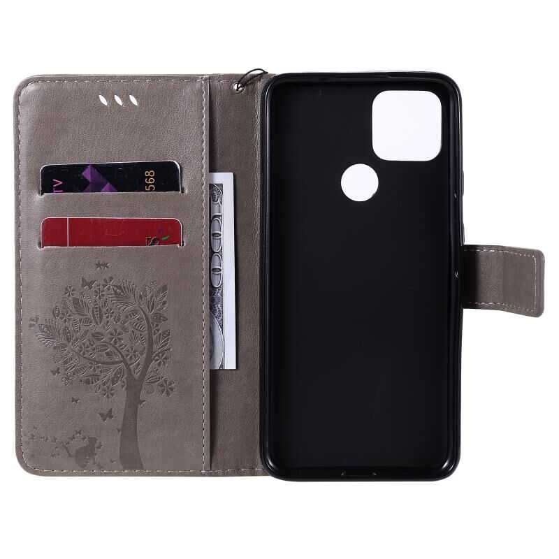 Θήκη δέρματος οριζόντιας αναδίπλωσης με σχέδιο δέντρου & γάτας σε ανάγλυφο για Google Pixel 4a 5G / Pixel 5 XL με βάση στήριξης & θήκες καρτών & πορτοφόλι & κορδόνι (Γκρι)