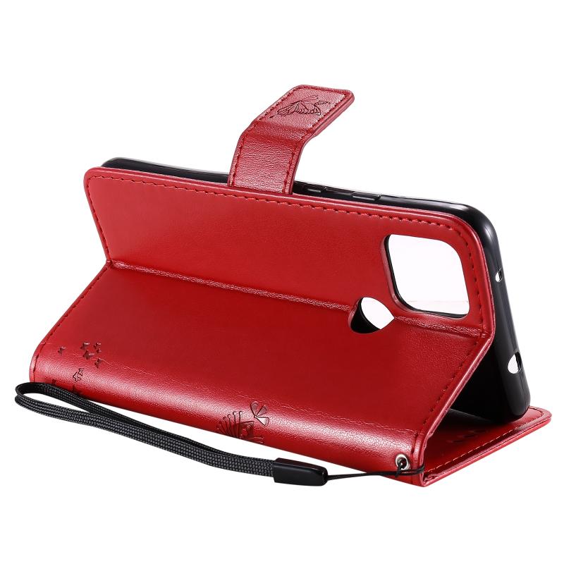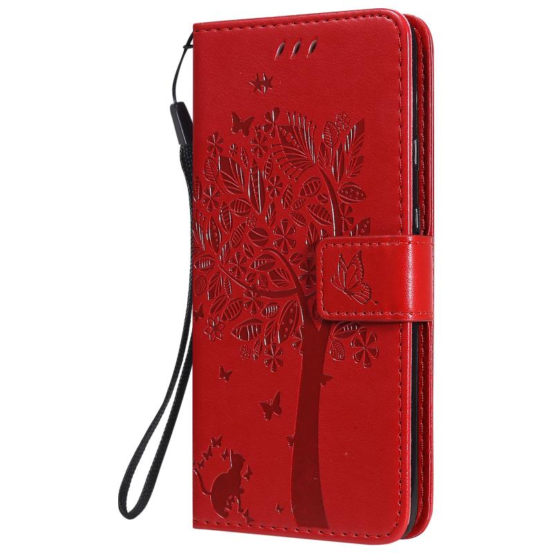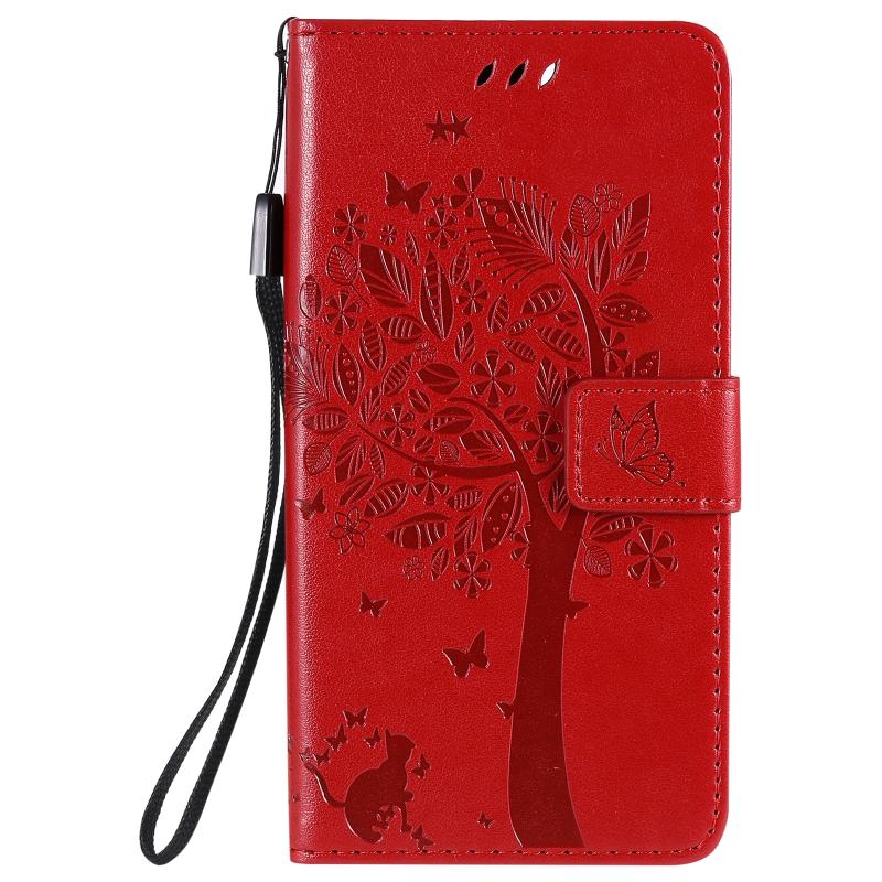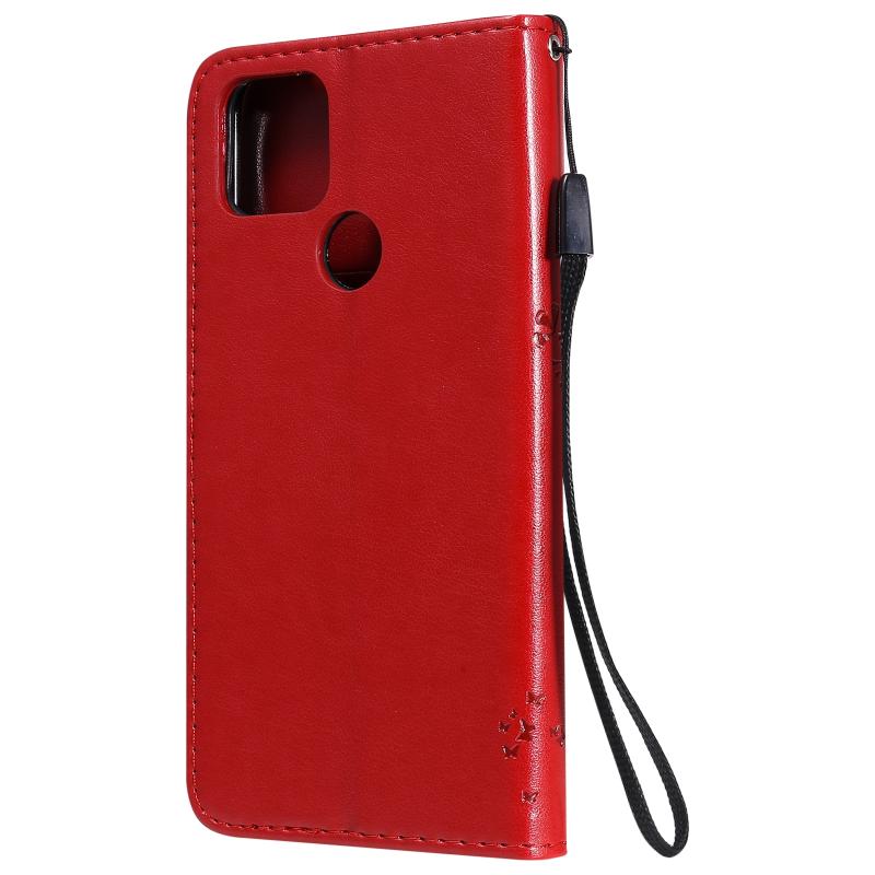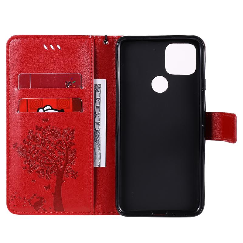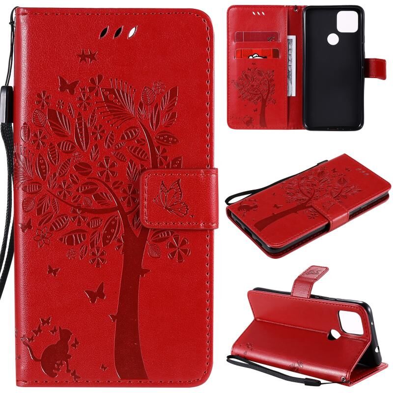 For Google Pixel 4a 5G / Pixel 5 XL Tree & Cat Embossed Pattern Horizontal Flip Leather Case with Holder & Card Slots & Wallet & Lanyard(Red)