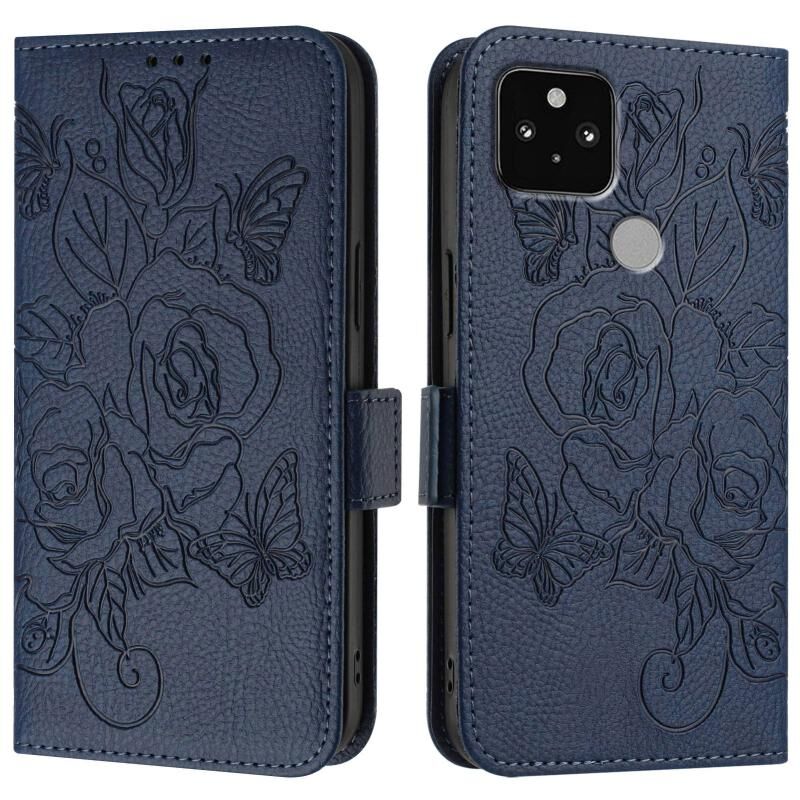 For Google Pixel 5 Embossed Rose RFID Anti-theft Leather Phone Case(Dark Blue)