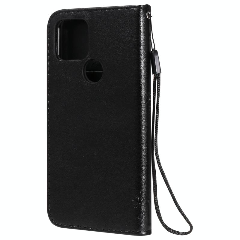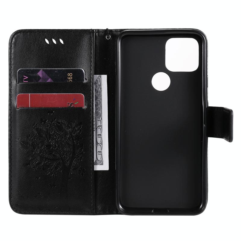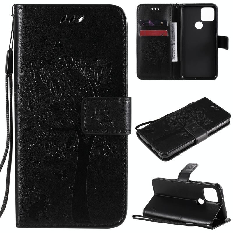 For Google Pixel 5 Tree & Cat Embossed Pattern Horizontal Flip Leather Case with Holder & Card Slots & Wallet & Lanyard(Black)