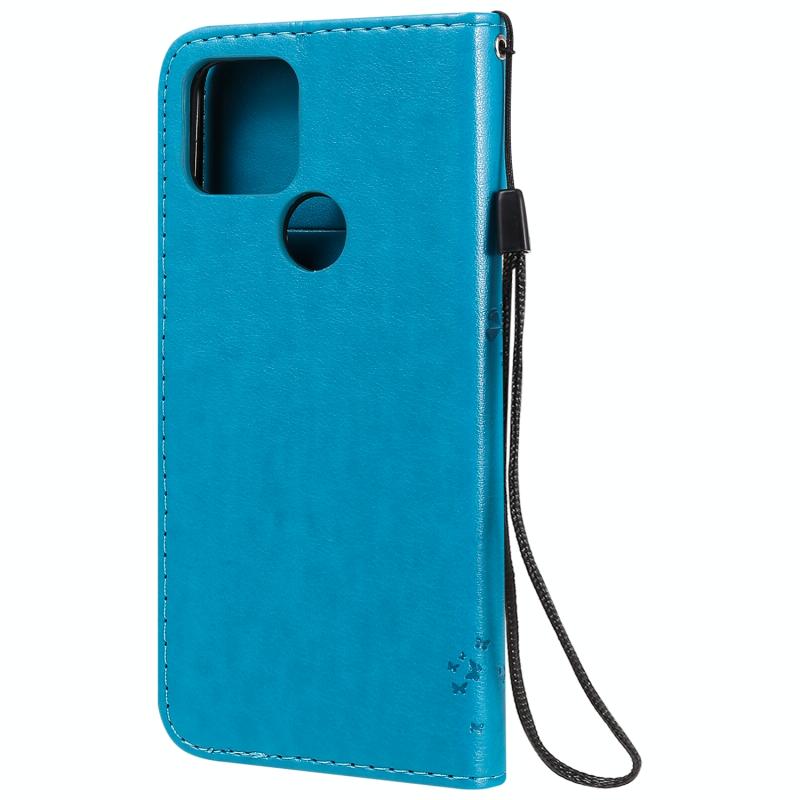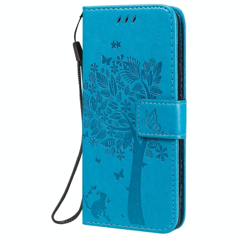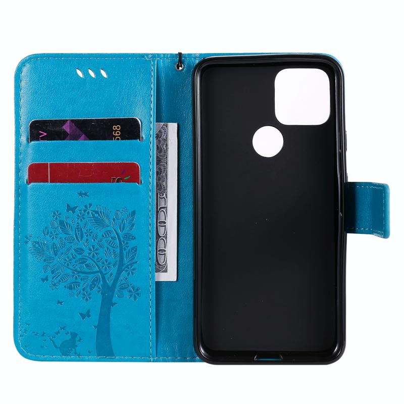For Google Pixel 5 Tree & Cat Embossed Pattern Horizontal Flip Leather Case with Holder & Card Slots & Wallet & Lanyard(Blue)
