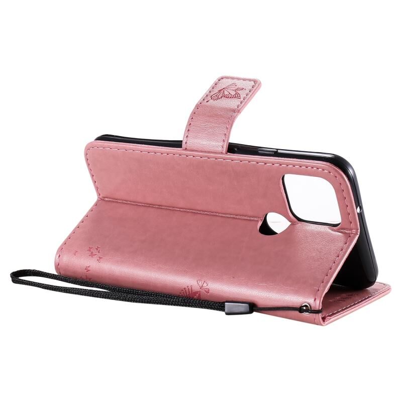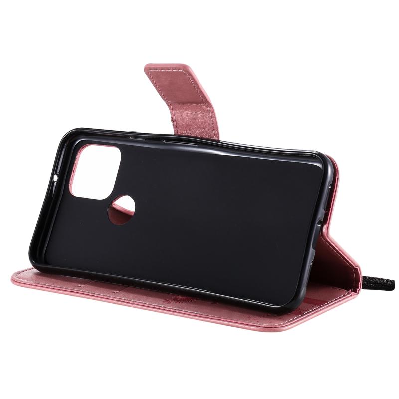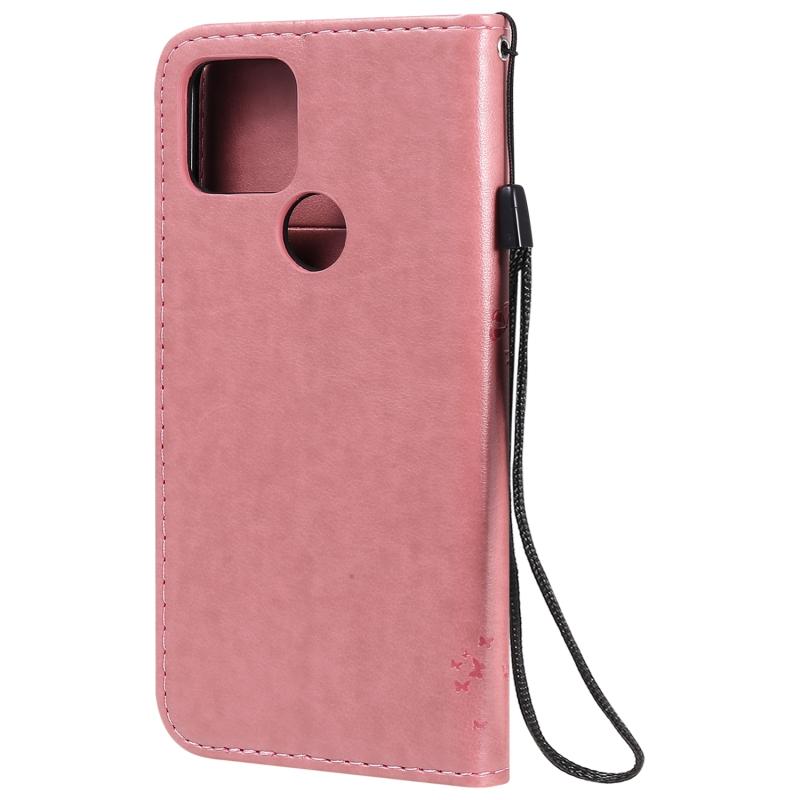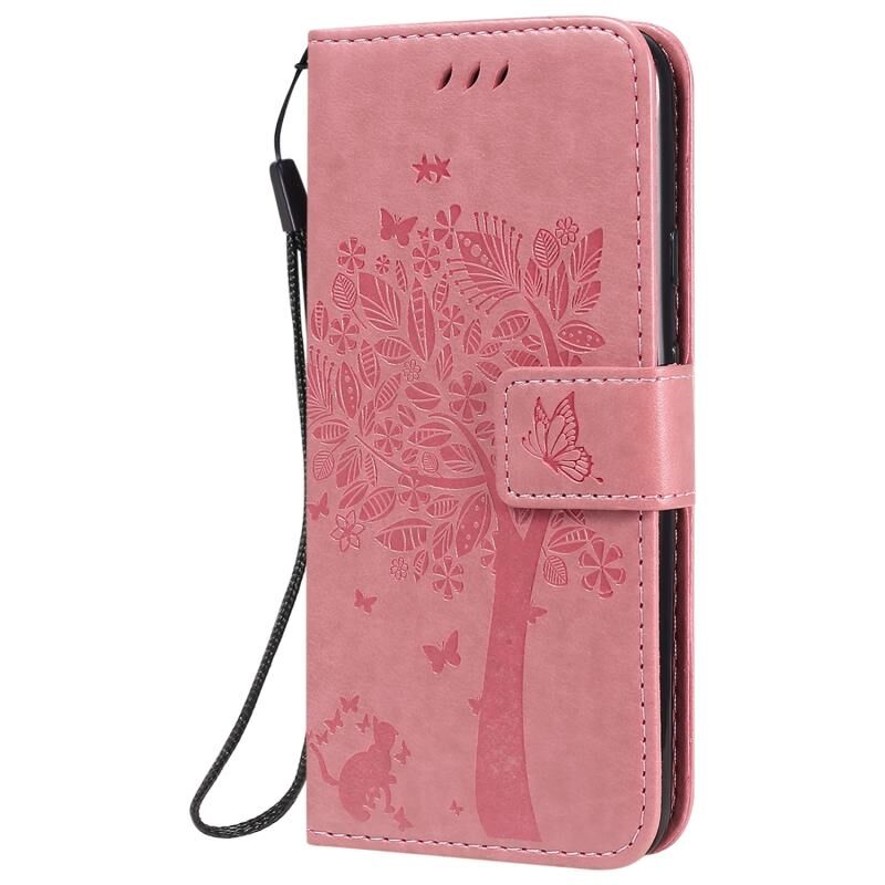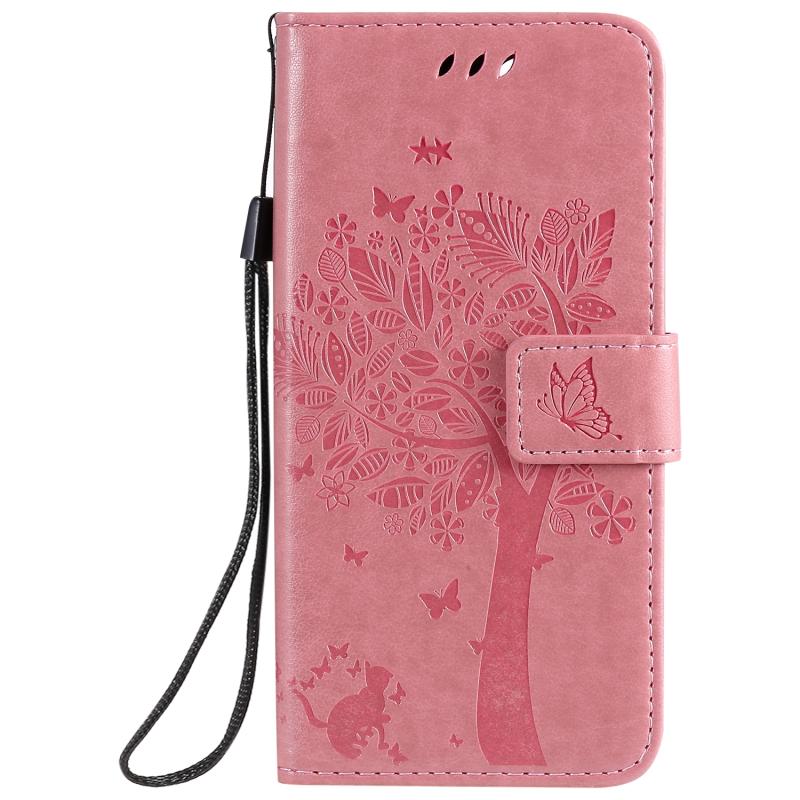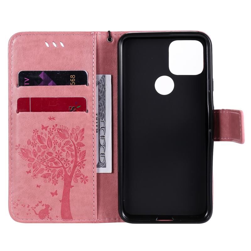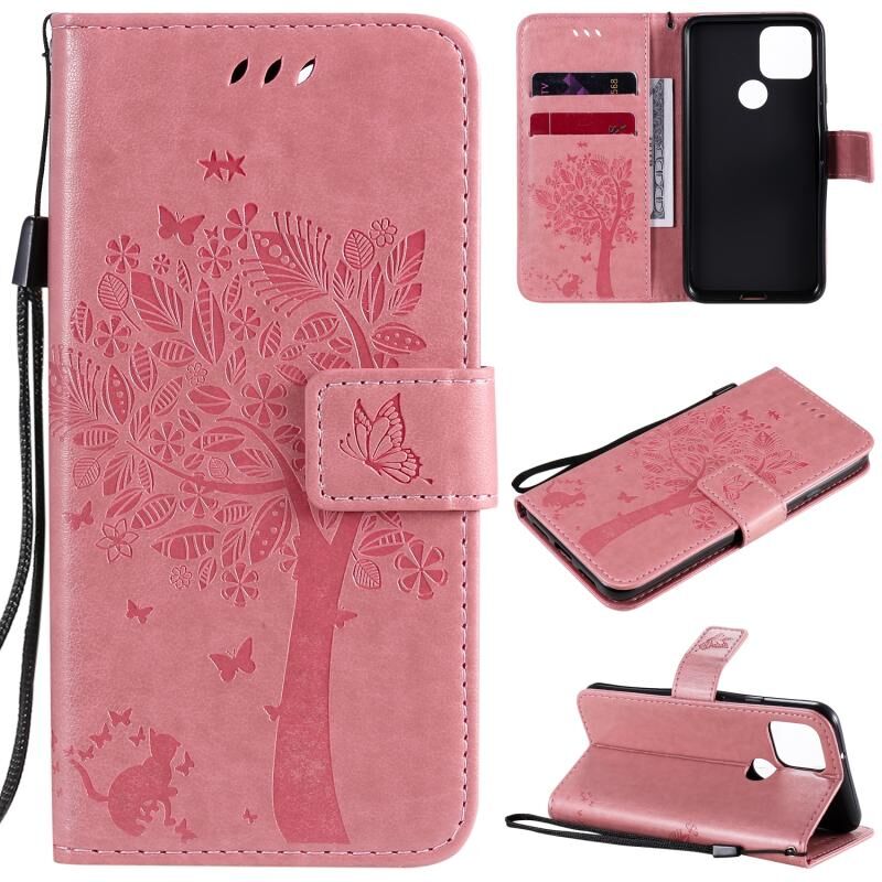 For Google Pixel 5 Tree & Cat Embossed Pattern Horizontal Flip Leather Case with Holder & Card Slots & Wallet & Lanyard(Pink)