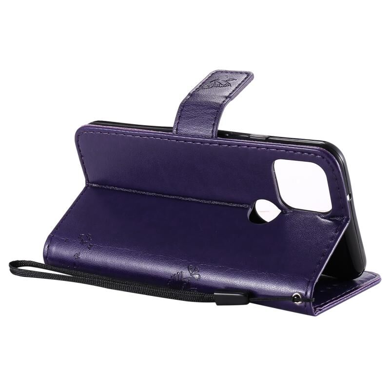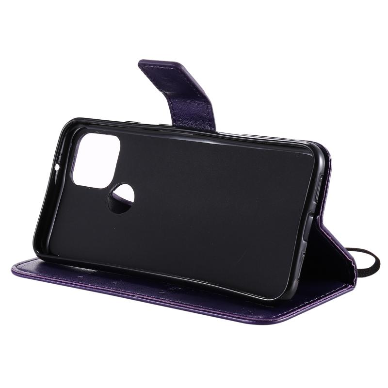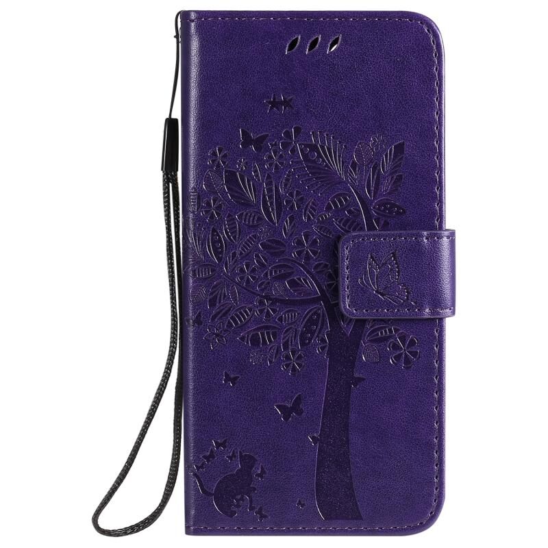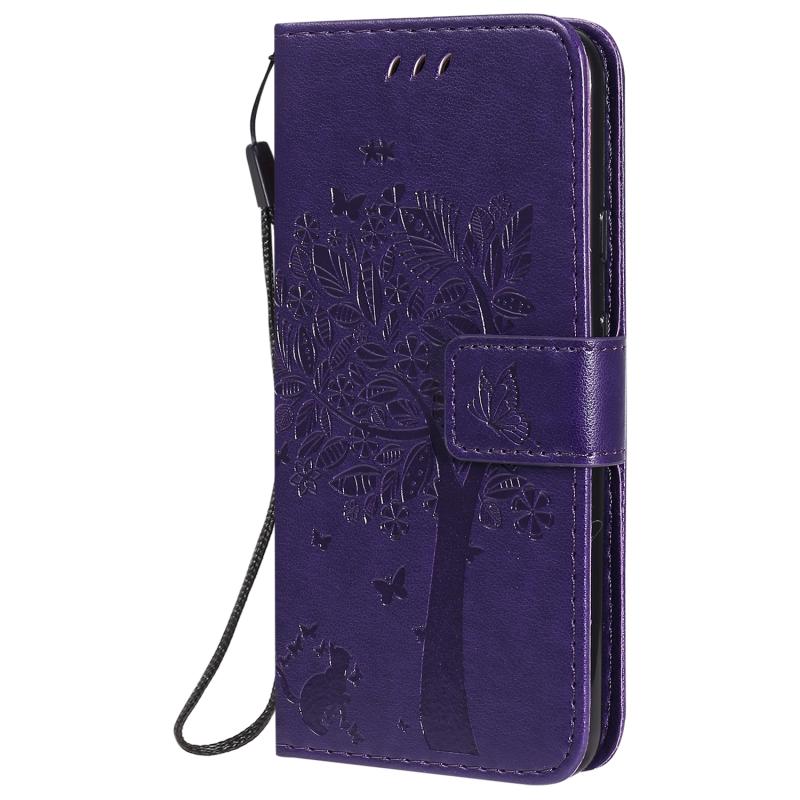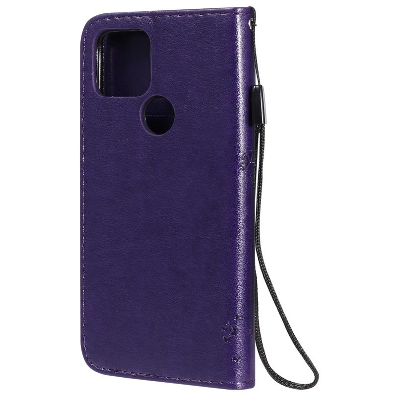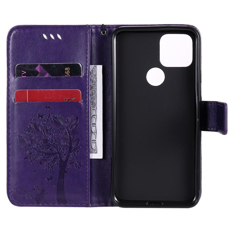 For Google Pixel 5 Tree & Cat Embossed Pattern Horizontal Flip Leather Case with Holder & Card Slots & Wallet & Lanyard(Purple)
