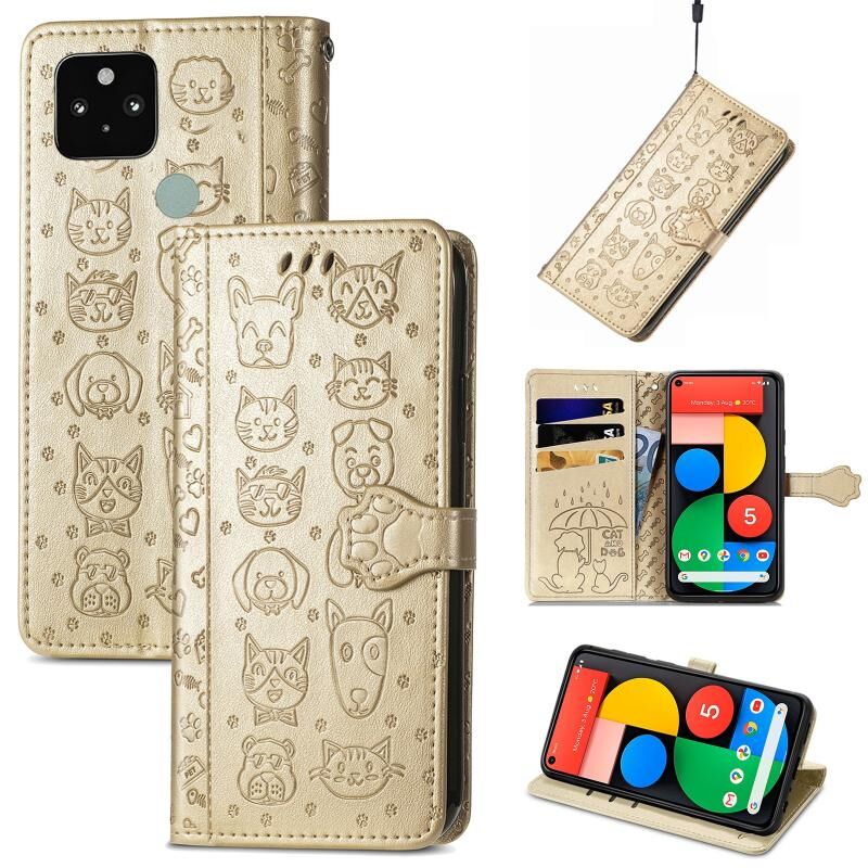 For Google Pixel 5 XL Cat and Dog Embossed Leather Phone Case(Gold)