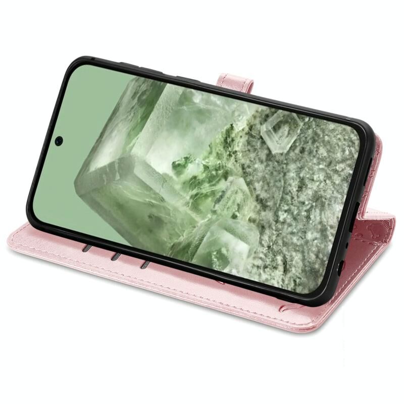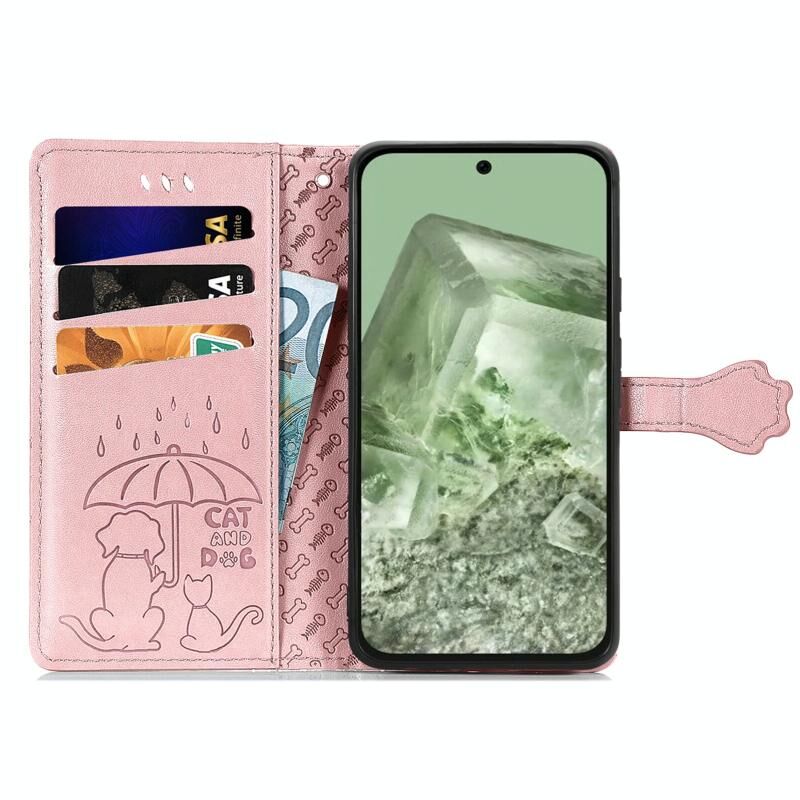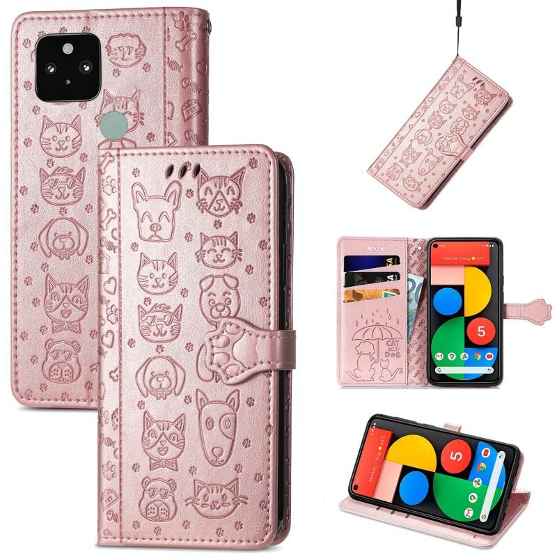 For Google Pixel 5 XL Cat and Dog Embossed Leather Phone Case(Rose Gold)