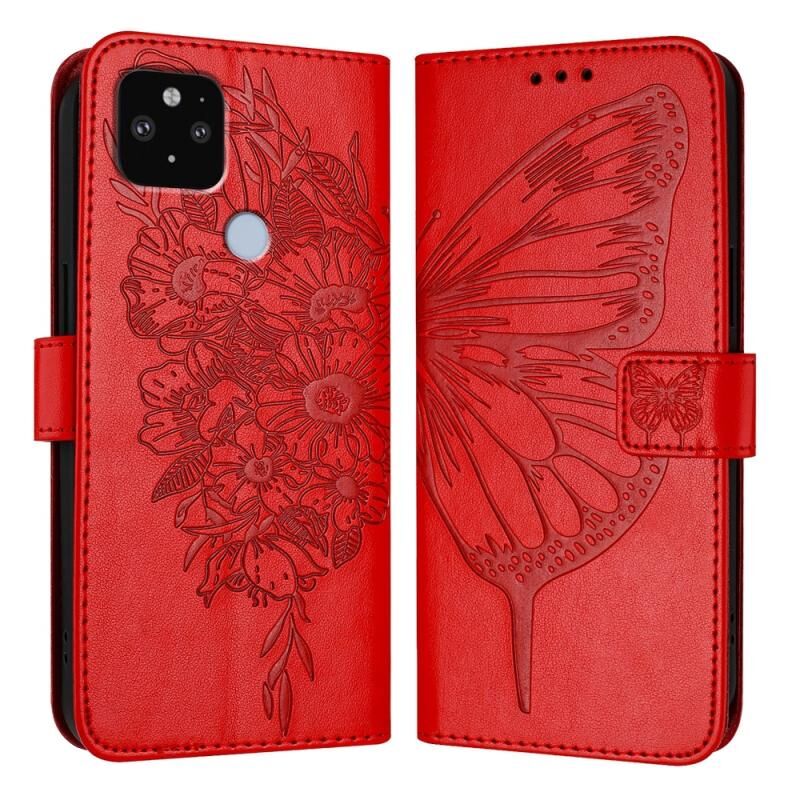 For Google Pixel 5 XL / Pixel 4a 5G Embossed Butterfly Leather Phone Case(Red)