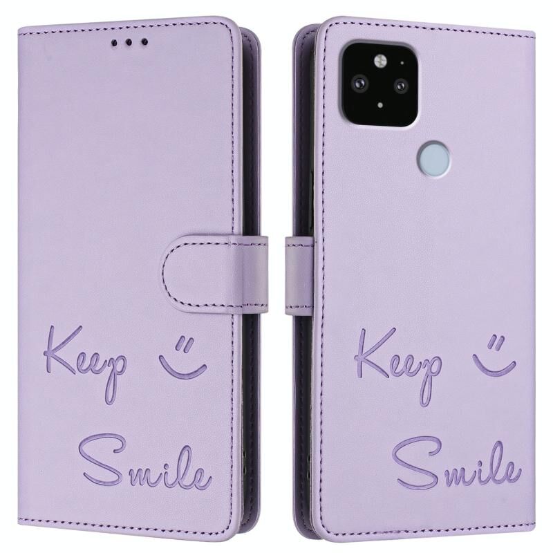 Για το Google Pixel 5 XL / Pixel 4a 5G Smile ανάγλυφη RFID δερμάτινη θήκη τηλεφώνου (ανοιχτό μοβ)