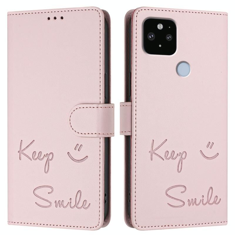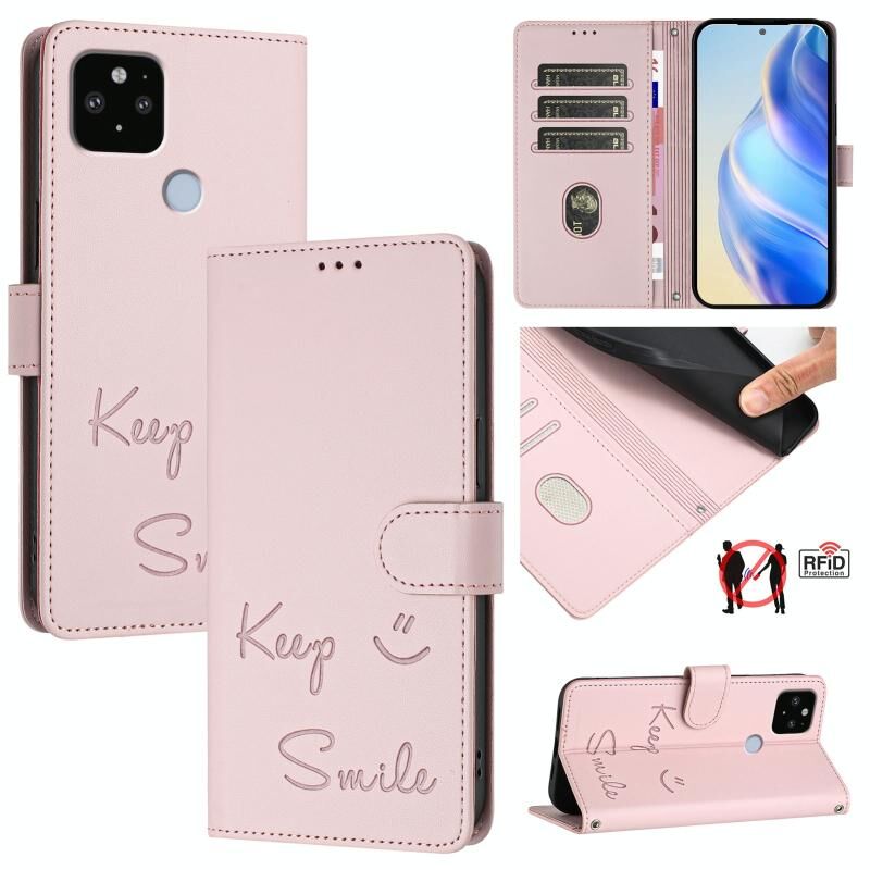 Για το Google Pixel 5 XL / Pixel 4a 5G Smile ανάγλυφη RFID δερμάτινη θήκη τηλεφώνου (ροζ)
