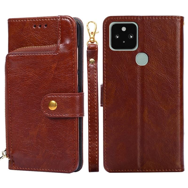 Για το Google Pixel 5 φερμουάρ τσάντα οριζόντια Flip δερμάτινη θήκη τηλεφώνου με θήκη & υποδοχές για κάρτες & κορδόνι (καφέ)