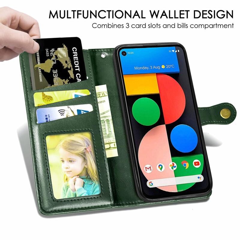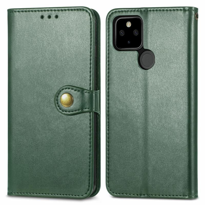 Για το Google Pixel 5a 5G Αμιγές χρώμα δερμάτινη θήκη τηλεφώνου με αγκράφα & κορνίζα φωτογραφιών & υποδοχή κάρτας & πορτοφόλι & λειτουργία στάσης (πράσινο)